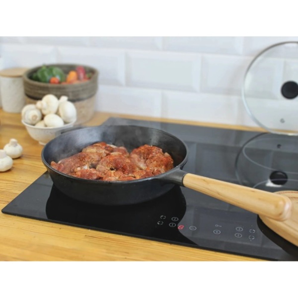 - У ній можна готувати безліч страв – від м'яса до яєчні. І не обов'язково доводити їх до готовності на плиті. Можна вимкнути і відправитися сервірувати стіл, чавунна сковорода сама доведе страву до кондиції.