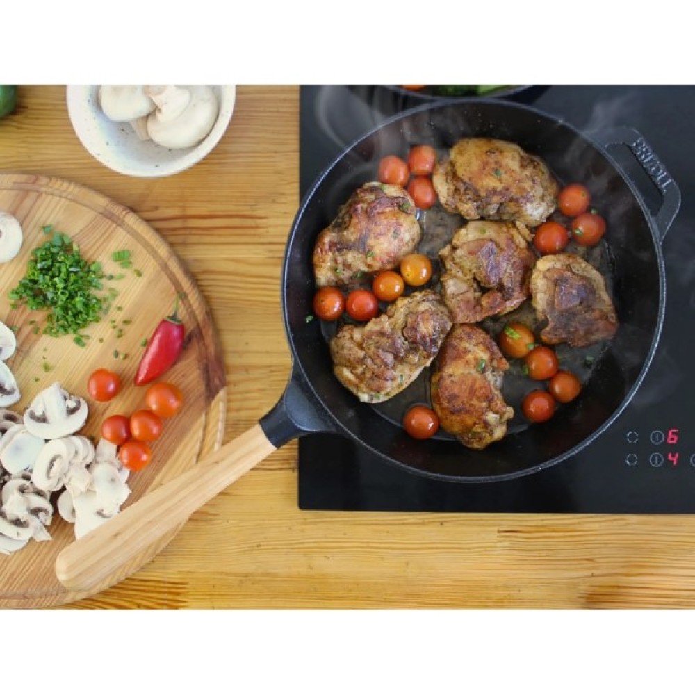 - У ній можна готувати безліч страв – від м'яса до яєчні. І не обов'язково доводити їх до готовності на плиті. Можна вимкнути і відправитися сервірувати стіл, чавунна сковорода сама доведе страву до кондиції.