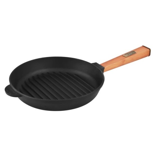 Представлена в асортименті сковорода гриль в оптимальних діаметрах 240-280 мм, Має зручну квадратну дерев’яну ручку, яка не нагрівається, надійно закріплена і добре лежить в руці. Із сковородою гриль зручно використовувати спеціальний чавунний притиск ТМ BRIZOLL. Така комбінація ідеально підійде для приготування курчат табака, ковбасок та стейків.