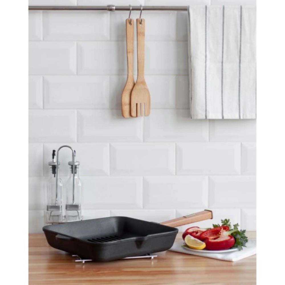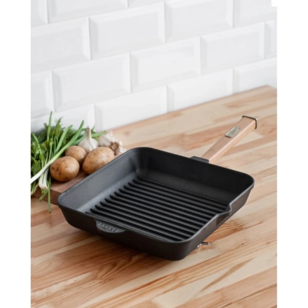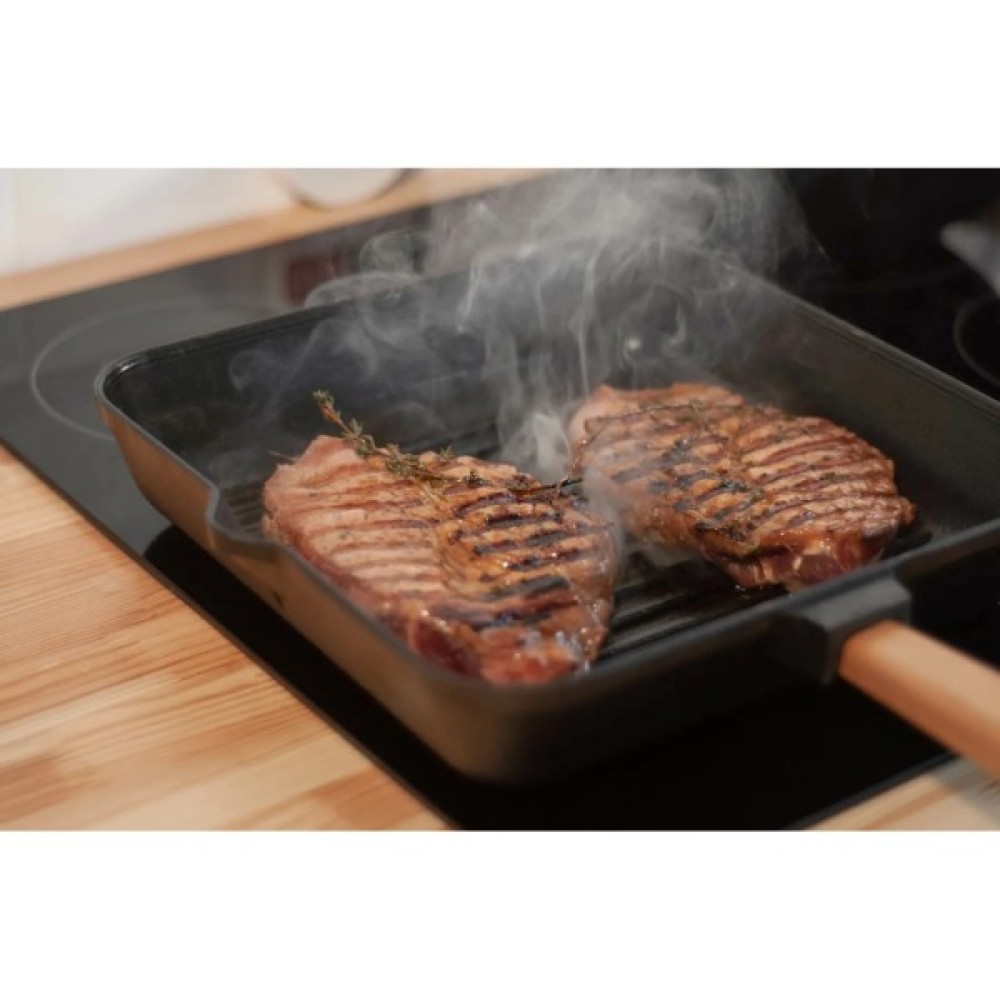 Квадратна сковорода гриль має оптимальний розмір 280 мм на 280 мм. Підходить для великої компанії, адже завдяки такій формі, вміщає в себе більше, в порівнянні з круглою. Має зручну квадратну дерев’яну ручку, яка не нагрівається, надійно закріплена і добре лежить в руці.
