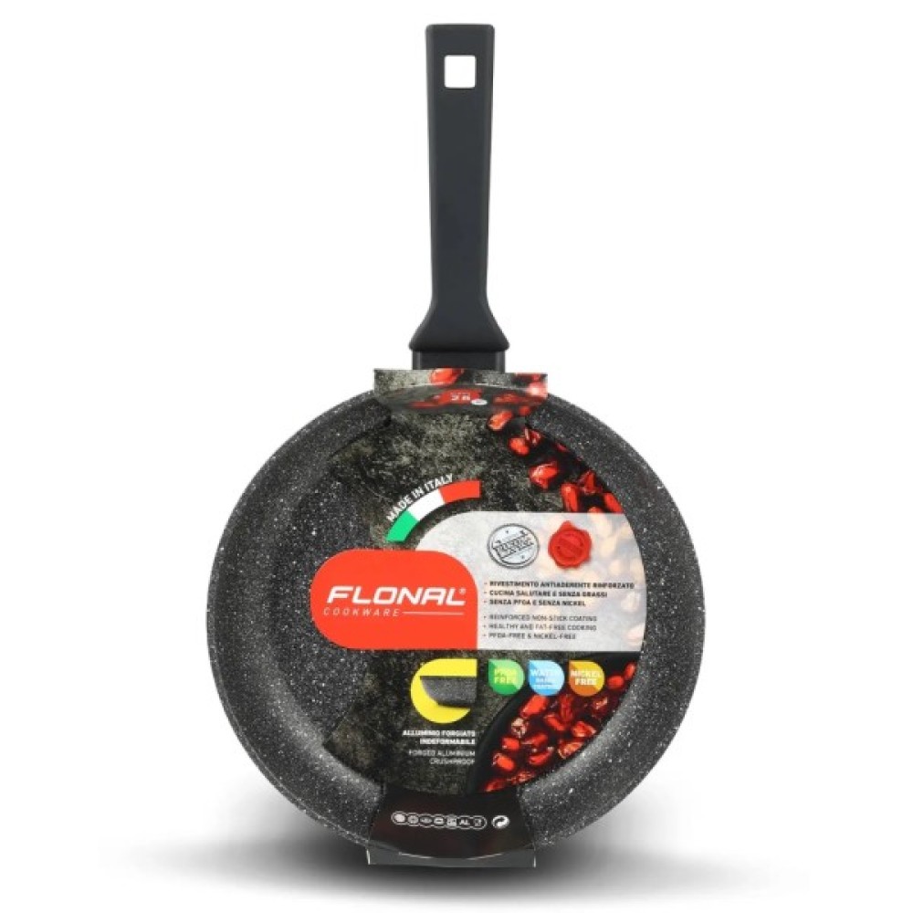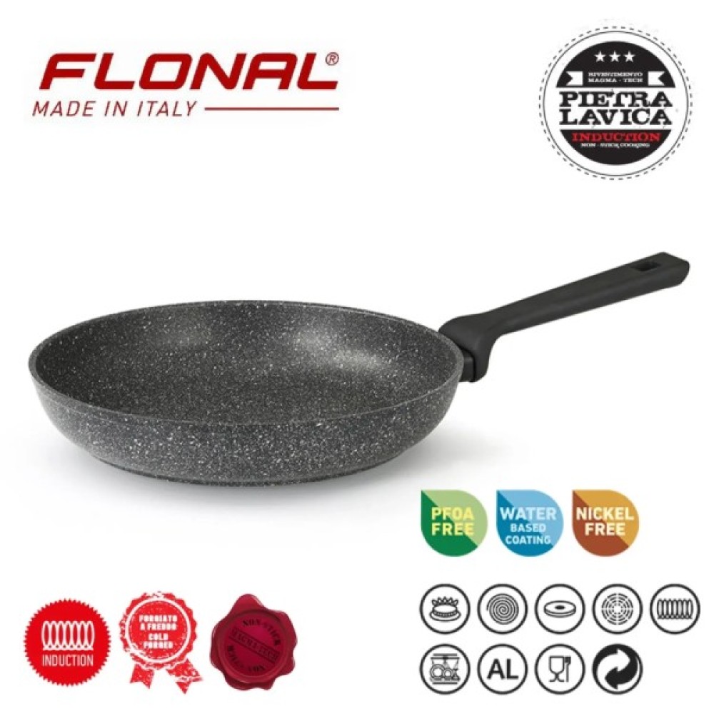 Посуд Flonal Pietra Lavica не випадково має чорний колір. Таке забарвлення антипригарного покриття Magma-Tech спричиняють срібні мінеральні слюди, що входять до складу антипригарного покриття, покращують його зовнішній вигляд, та одночасно роблять більш стійким до зношування. Екологічно чисте антипригарне покриття Magma-Tech, що не містить шкідливих і алергенних речовин, складається з чотирьох внутрішніх шарів, підсилених твердими мікромінеральними часточками, та лишається стійким навіть при використанні металевих кухонних аксесуарів, роблячи можливим приготування їжі без додавання олії.