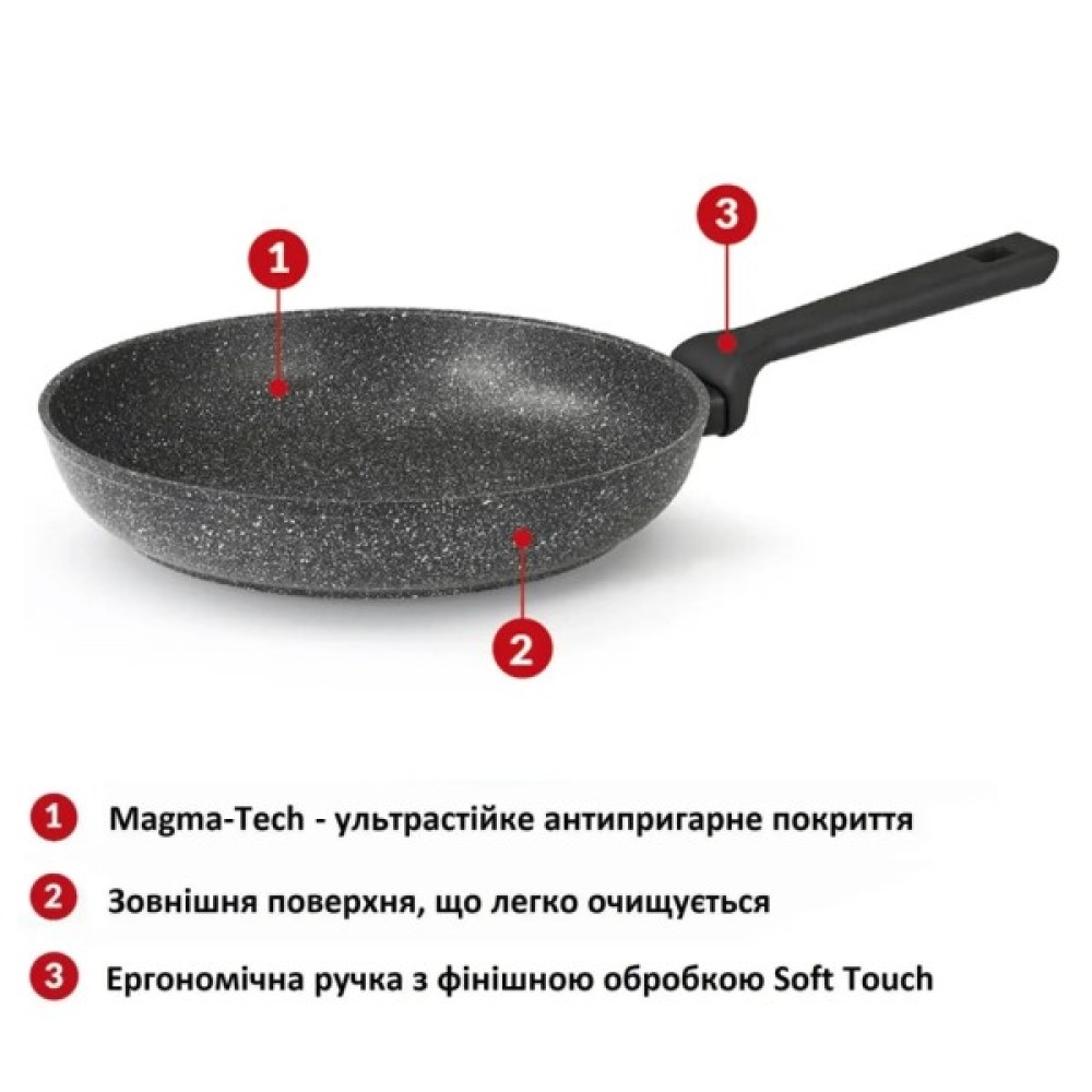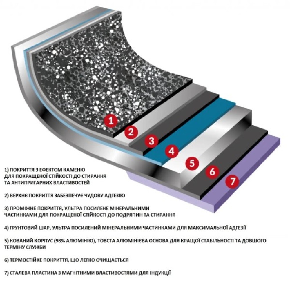 Потовщені стінки і багатошарове дно дозволяють готувати не тільки широкий спектр щоденних страв, а й роблять цю сковороду придатною для тушкування, та приготування більш складних блюд. Феромагнітне дно робить сковороду придатною для будь-якої нагрівальної поверхні, включаючи індукційні плити. Алюмінієвий ободок по периметру сковорідки робить її більш витривалою до ударів та сприяє утриманню первинної форми навіть під час тривалого використання. Зовнішнє антипригарне покриття робить догляд за сковородою легким і швидким.