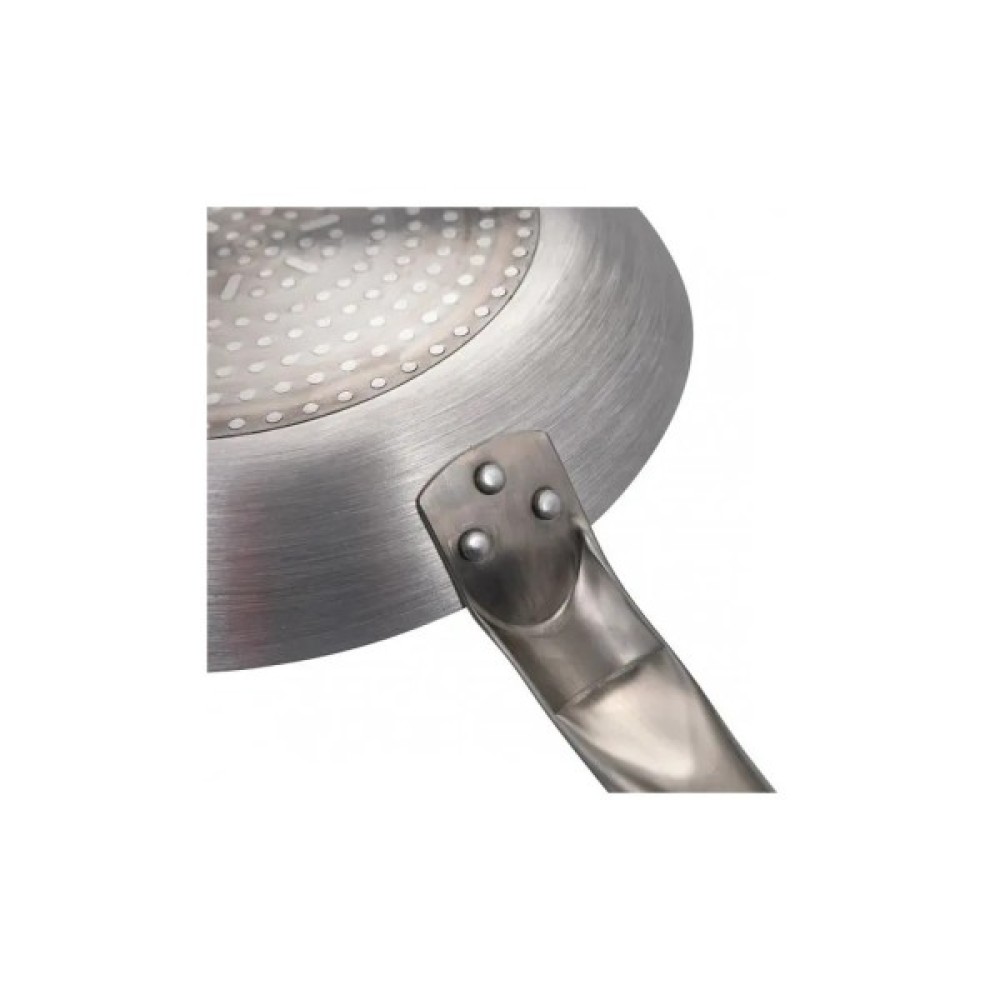Порожниста ручка сковорідки виготовлена із нержавіючої сталі. Прикріплена до основи за допомогою заклепок, тому ручка не нагрівається.