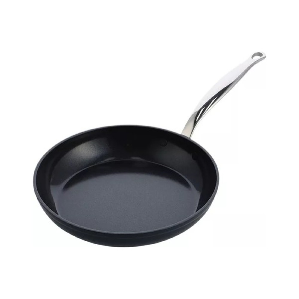 Алюмінієва сковорода GreenPan Barcelona Pro з антипригарним покриттям має витончений дизайн і виглядає чудово завдяки дзеркальній ручці з нержавіючої сталі, що контрастує з її чорним як смола корпусом.