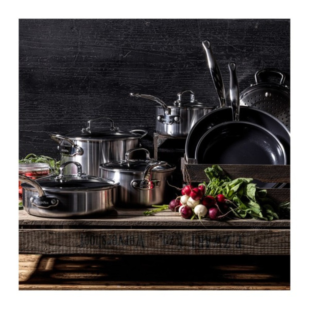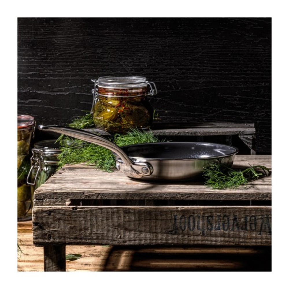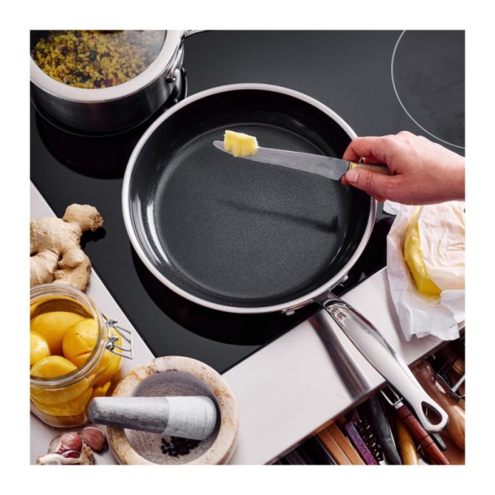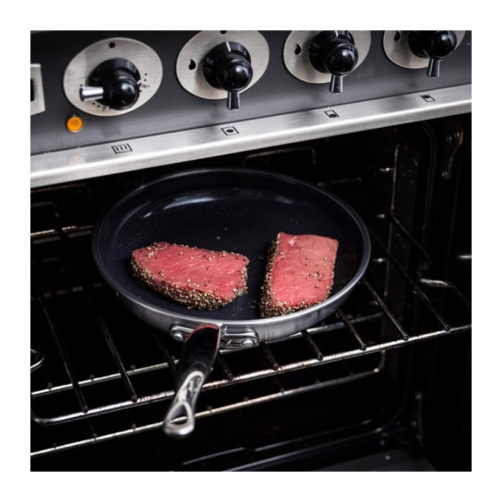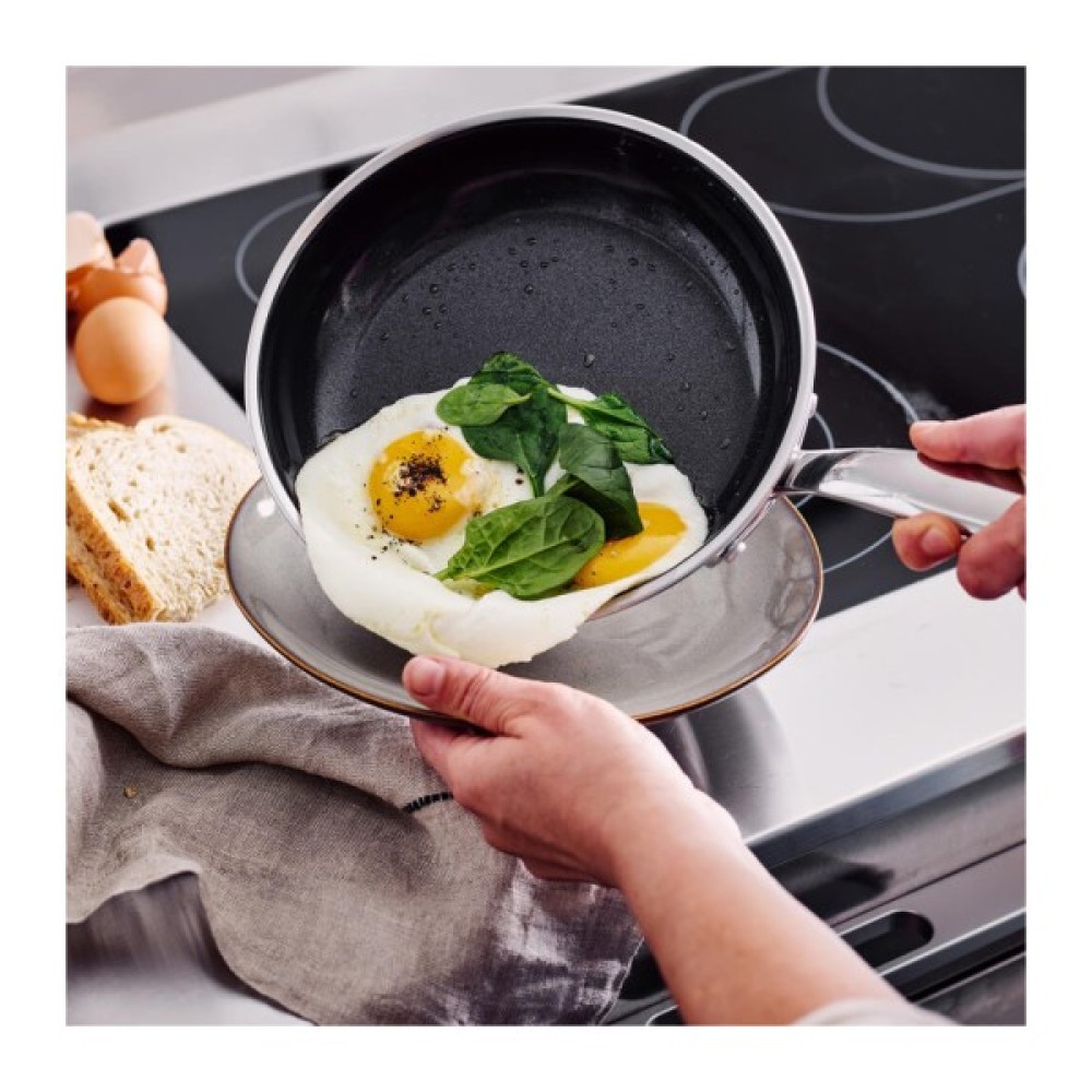Ця сковорода, що входить у високотехнологічну колекцію Premiere від GreenPan, виготовлена із професійної 3-шарової нержавіючої сталі з алюмінієвою основою для оптимального розподілу тепла та максимальної ефективності. Посуд GreenPan Premiere можна використовувати на всіх типах плит, включаючи індукційні, а якщо потрібно довести страву до готовності в духовці, її можна використовувати в духовці при температурі до 220 °C.