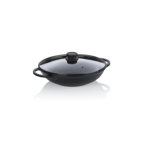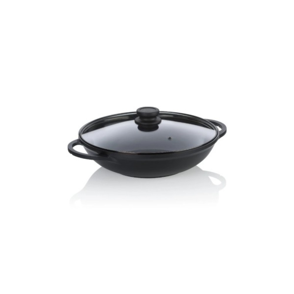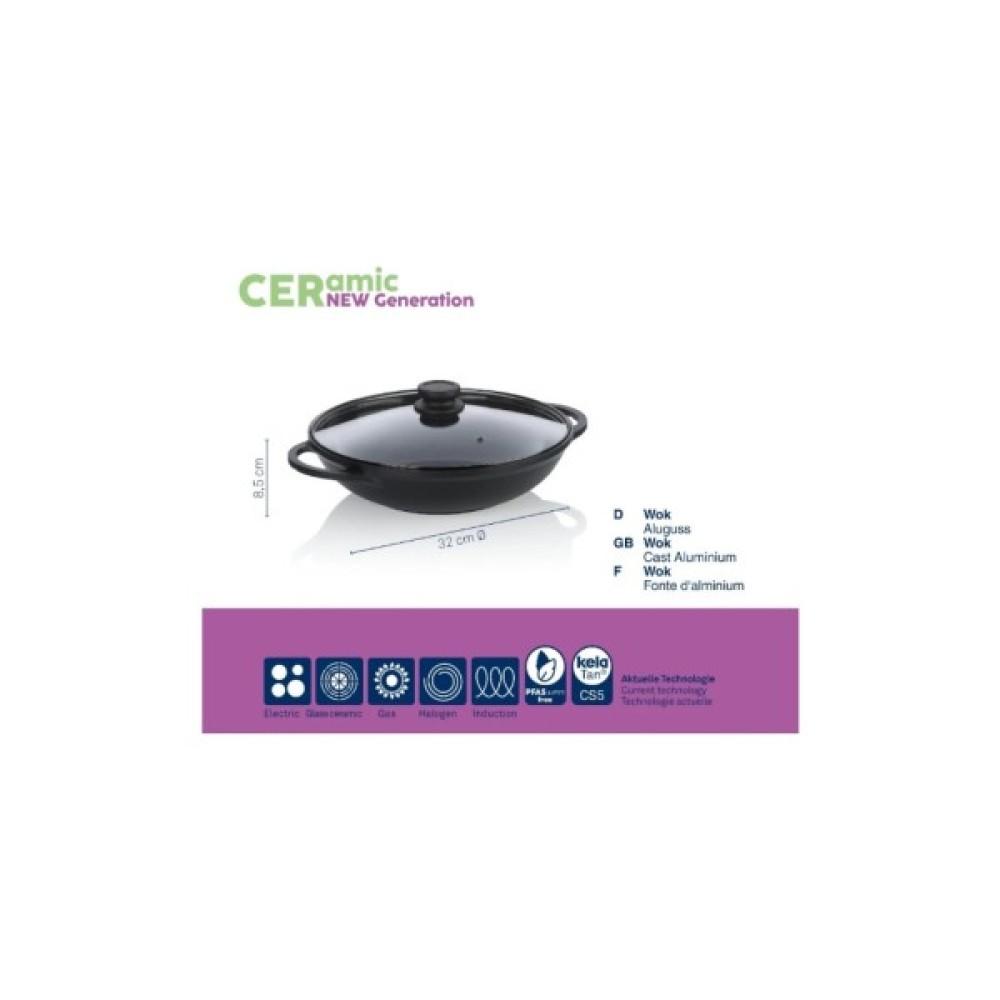 Вок з кришкою та двома ручками KELA Atura від німецького виробника посуду виготовлена з литого алюмінію. Керамічне покриття вок-сковороди KELA Atura нового покоління без ПФАС (PFAS), термостійкість виробу до 250°C. Діаметр: 32 см.