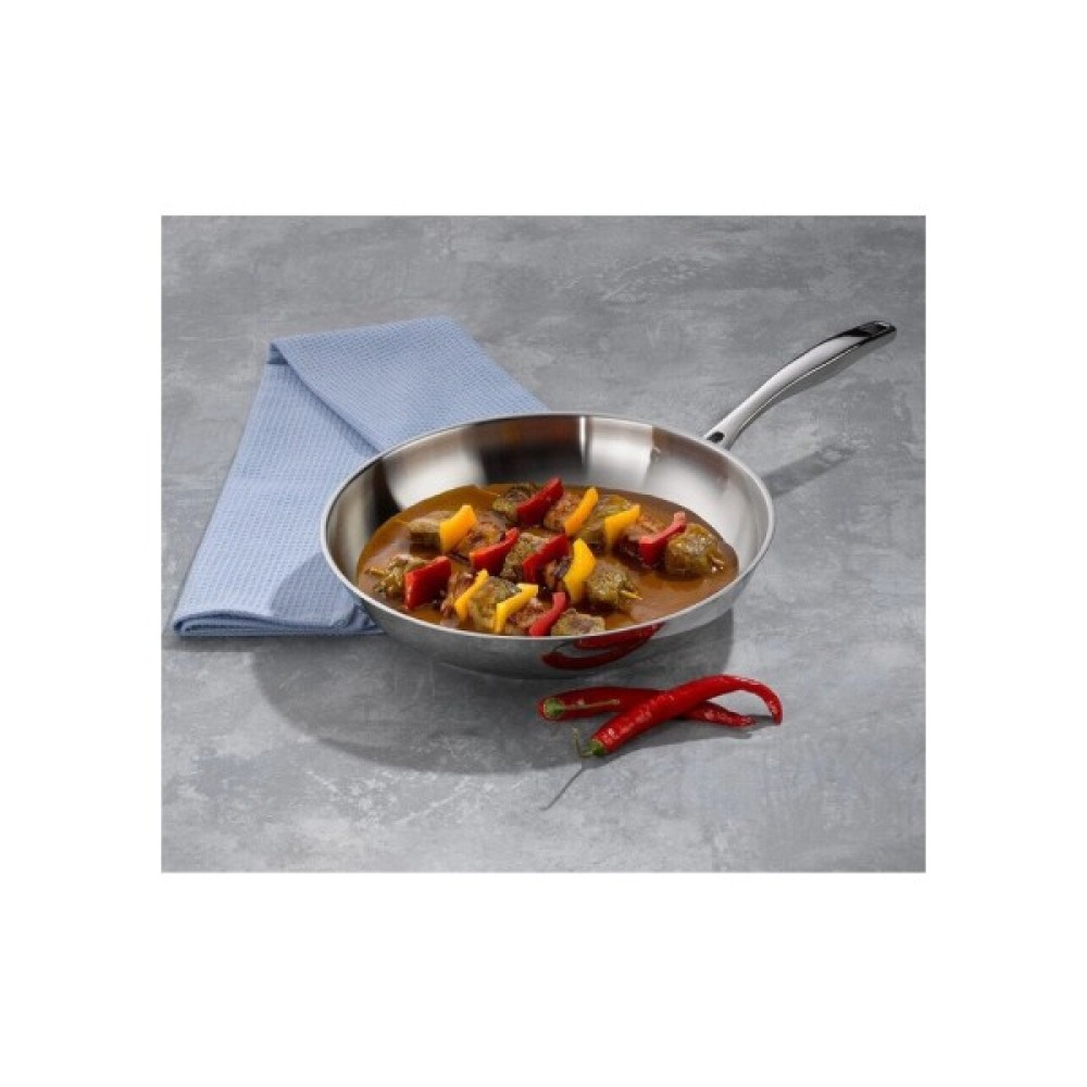 Виготовлена сковорода KELA Flavoria з нержавіючої сталі 18/10 з глянцевою поверхнею, і зовсім не схильна до корозії. Ручка у сковороди KELA Flavoria має отвір для зберігання в підвішеному вигляді. Сковороди серії Flavoria підходять для всіх типів кухонних плит, включаючи індукційні, та можуть використовуватися при температурі до 220°C.