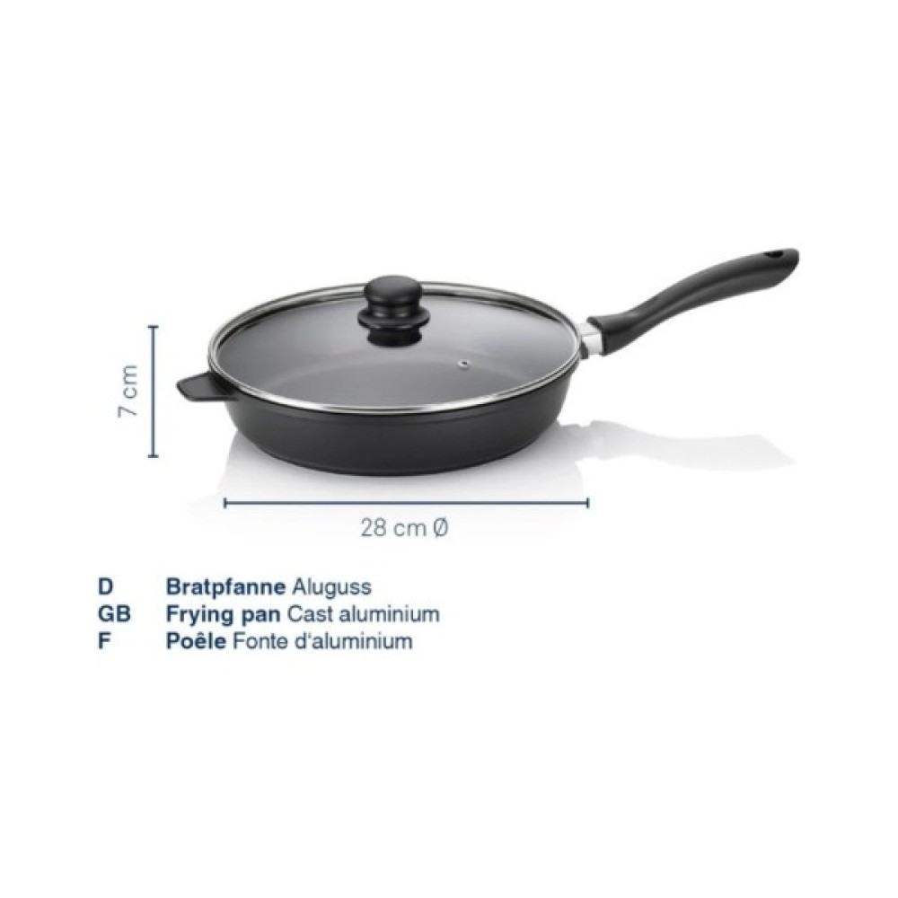 Сковорода KELA Gabor діаметром зі скляною кришкою та захистом виготовлена з литого алюмінію з антипригарним покриттям. У комплекті прозора скляна кришка, яка дозволяє контролювати процес приготування без необхідності відчиняти ємність зі стравою. Захисний протектор у формі сніжинки призначений для дбайливого зберігання сковорідки KELA Gabor, яка має антипригарне покриття, вразливе до подряпин.