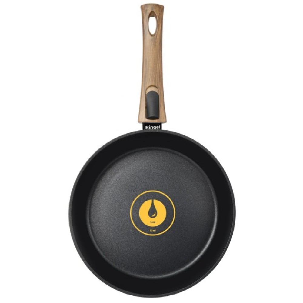 У кожну сковороду RINGEL інтегрована перша у світі система дозування олії. Найменша поділка системи відповідає 5 мл олії, а більша – 10 мл олії. За допомогою цієї системи ви зможете легко та швидко приготувати водночас здорові та смачні страви з використання мінімуму жиру та з максимальним збереженням корисних речовин у страві.