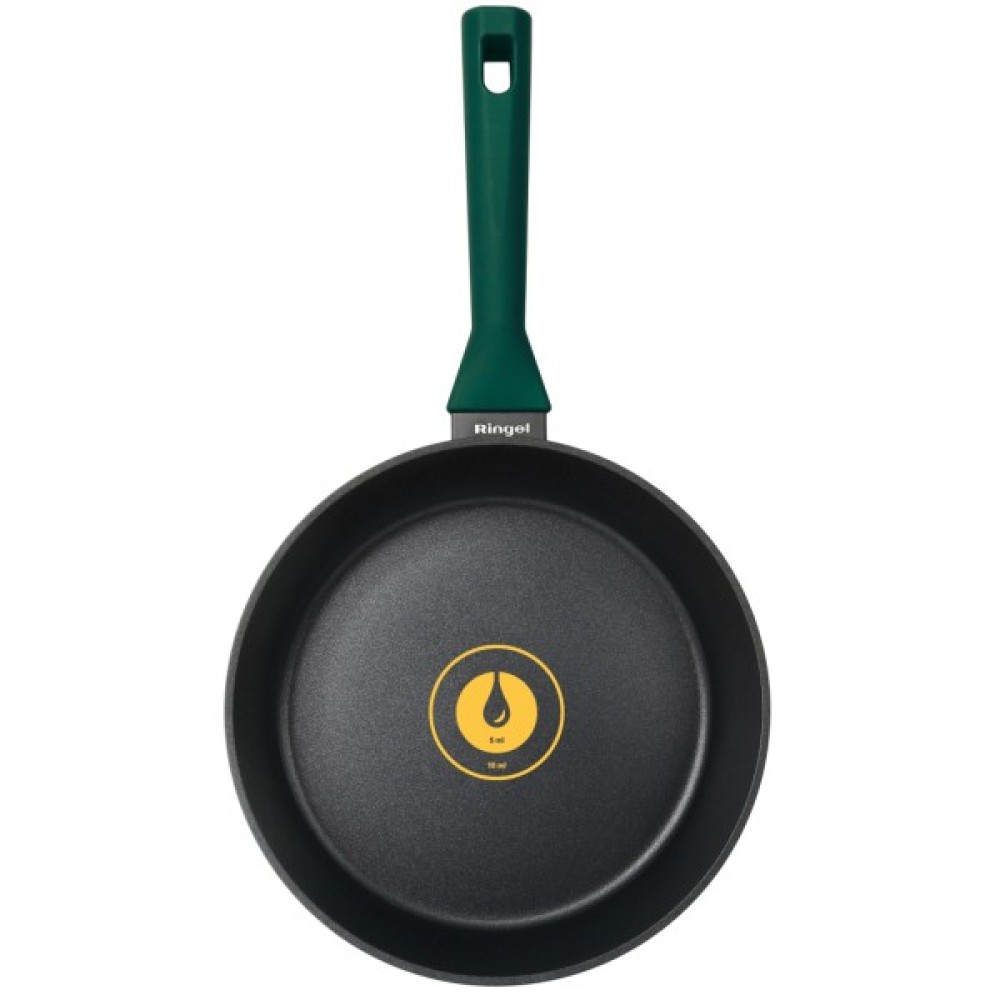 У кожну сковороду RINGEL інтегрована перша у світі система дозування олії. Найменша поділка системи відповідає 5 мл олії, а більша – 10 мл олії. За допомогою цієї системи ви зможете легко та швидко приготувати водночас здорові та смачні страви з використання мінімуму жиру та з максимальним збереженням корисних речовин у страві.