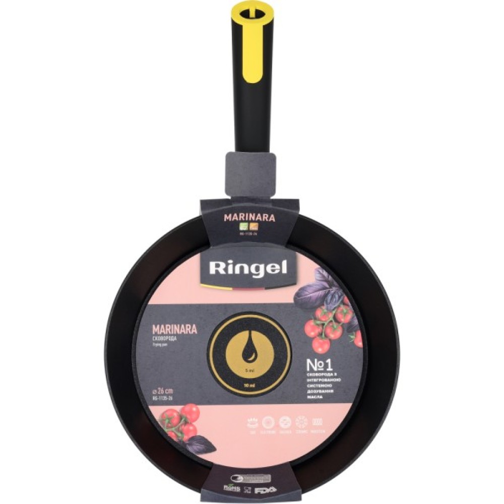 В кожну сковороду RINGEL інтегрована перша в світі система дозування олії. Найменша поділка системи відповідає 5 мл олії, а більша – 10 мл олії. За допомогою цієї системи ви зможете легко та швидко приготувати водночас здорові та смачні страви з використання мінімуму жиру та з максимальним збереженням корисних речовин у страві.