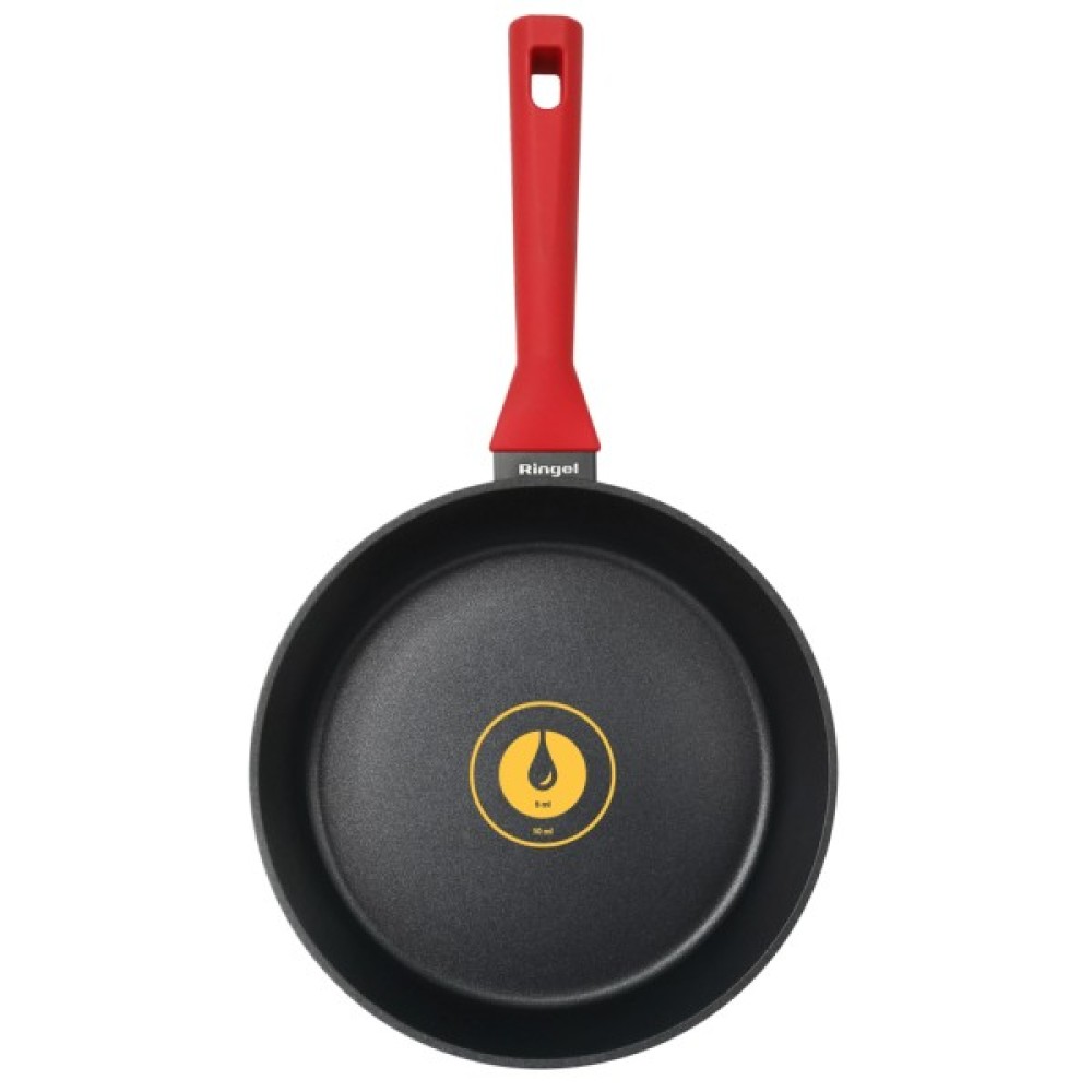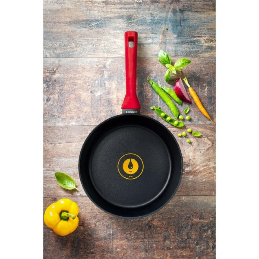 У кожну сковороду RINGEL інтегрована перша у світі система дозування олії. Найменша поділка системи відповідає 5 мл олії, а більша – 10 мл олії. За допомогою цієї системи ви зможете легко та швидко приготувати водночас здорові та смачні страви з використання мінімуму жиру та з максимальним збереженням корисних речовин у страві.