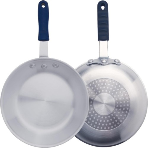 Алюмінієва сковорода від Winco виготовлена за технологією, що поєднує алюмінієвий корпус з пластиною з нержавіючої сталі, для ефективного використання на індукційних плитах. В процесі приготування страв з використанням олії на сковороді формується природне антипригарне покриття. Підходить як для професійного, так і для домашнього використання.