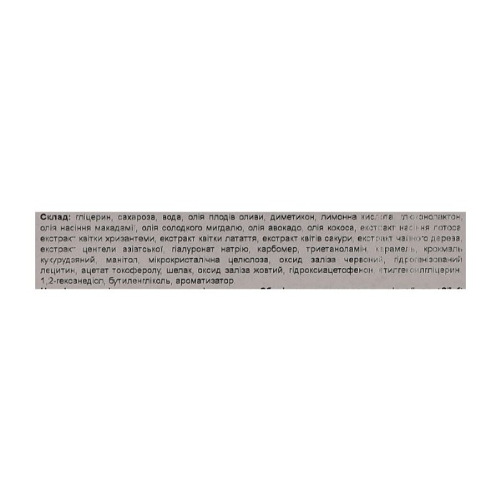 Склад Glycerin, Sucrose, Water, Olea Europaea (Olive) Fruit Oil, Dimethicone, Citric Acid, Gluconolactone, Macadamia Ternifolia Seed Oil, Prunus Amygdalus Dulcis (Sweet Almond) Oil, Persea Gratissima (Avocado) Oil, Cocos Nucifera (Coconut) Oil, Nelumbo Nucifera Extract, Chrysanthemum Morifolium Flower Extract, Nymphaea Alba Flower Extract, Prunus Serrulata Flower Extract, Melaleuca Alternifolia (Tea Tree) Extract, Centella Asiatica Extract, Sodium Hyaluronate, Carbomer, Triethanolamine, Caramel, Zea M