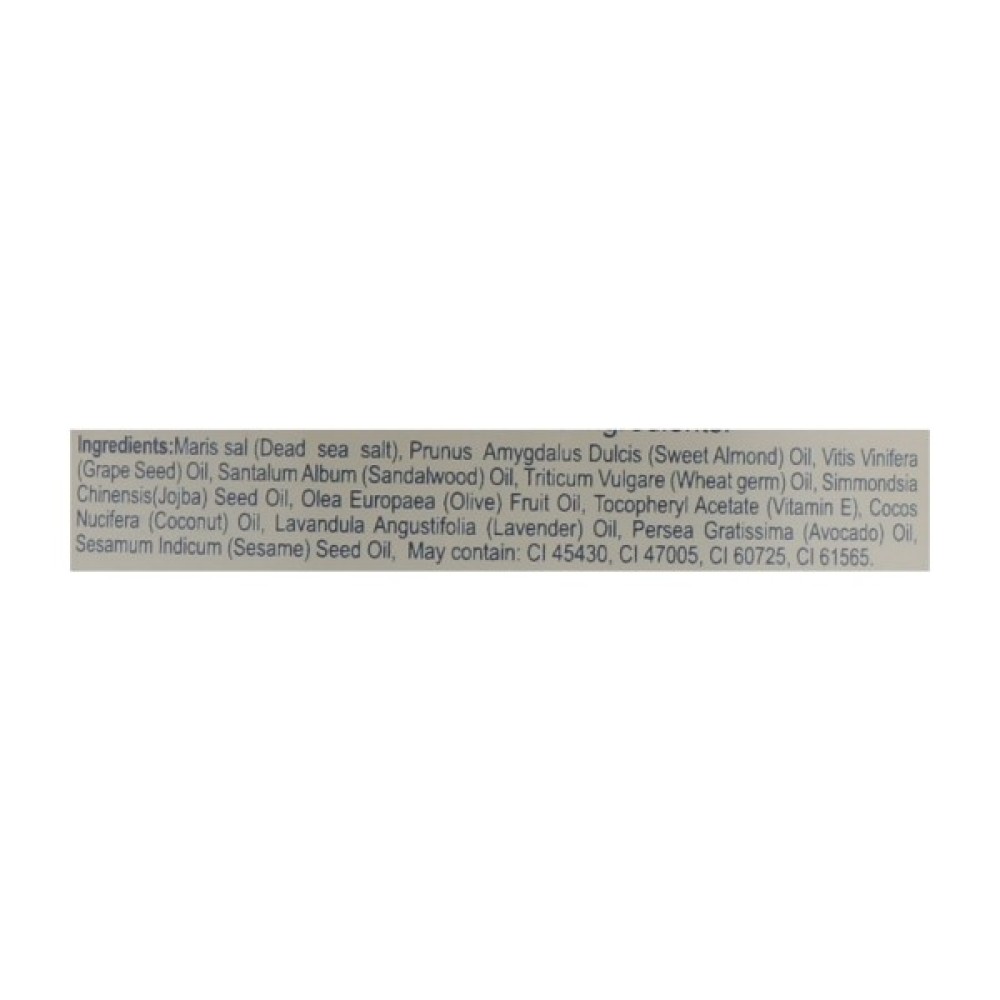 Maris sal (Dead sea salt), Prunus Amygdalus (Sweet Almond) oil, Triticum Vulgare (Wheat) germ oil, Lavandula Angustifolia) oil, Sandalwood (Santalum Album) oil. May contain: CI 45430, CI 47005, CI 60725, CI 61565.