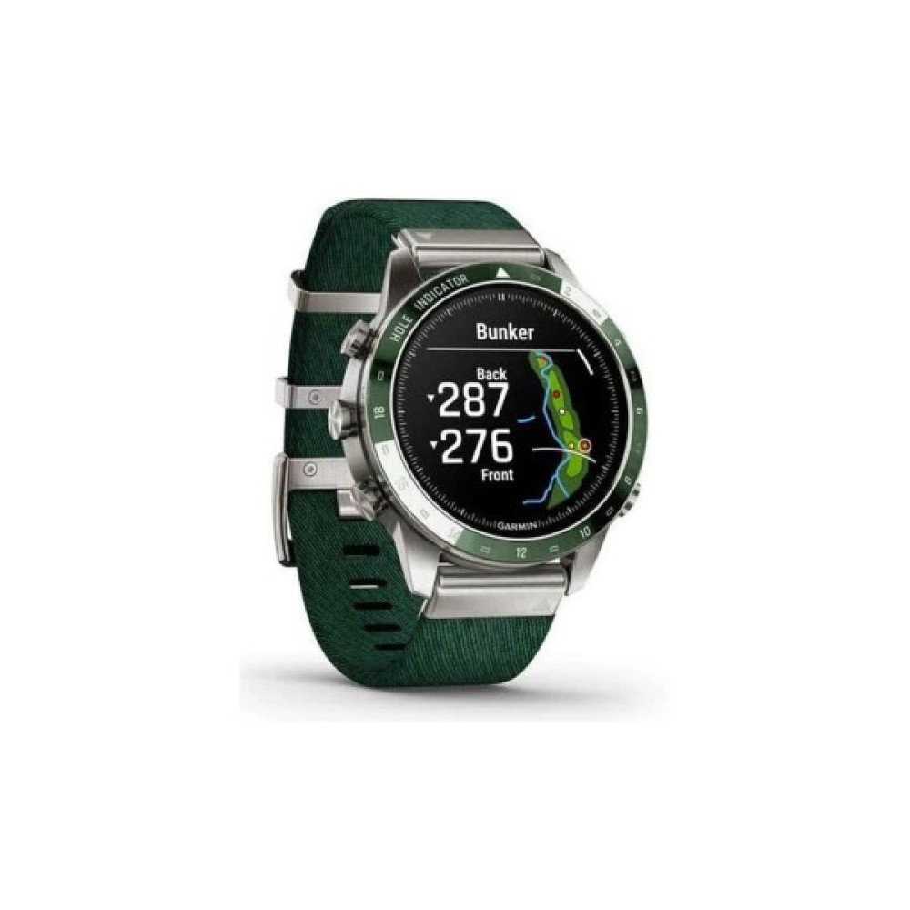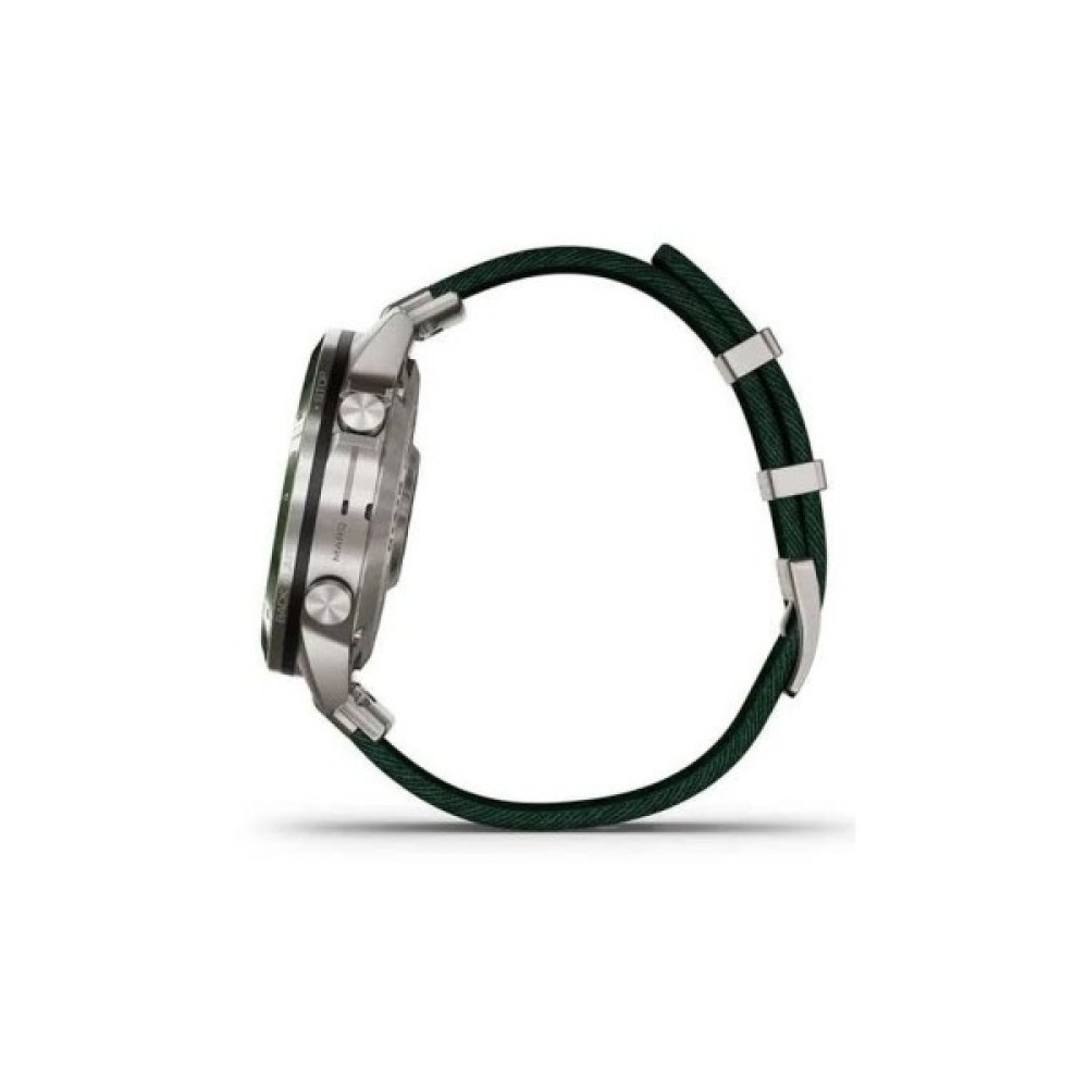 Смарт-годинник Garmin MARQ Golfer Gen 2 (010-02648-21) – це справжній втілення класу та функціональності для сучасного чоловіка, який цінує як стиль, так і технології. Цей годинник з круглим циферблатом, який окреслює п'яте покоління титану, ― це справжнє дизайнерське рішення, яке поєднує сапфірове скло та зелену керамічну вставку на спеціальному гравірованому безелі. Завершує образ тритонний зелений нейлоновий ремінець із жаккардової палітурки, що підкреслене любителями гри в гольф.