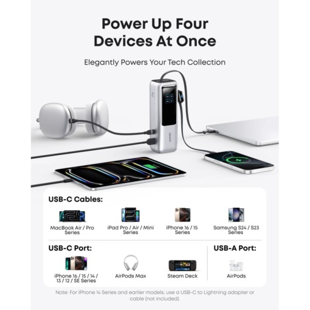 Anker Power Bank оснащений одним портом USB-C (до 100 Вт) та одним USB-A (до 33 Вт), а також двома вбудованими кабелями USB-C (до 100 Вт), що дозволяє заряджати до чотирьох пристроїв одночасно. Один кабель повністю ховається всередину корпусу, другий — виконує ще й роль зручного ремінця для перенесення. Жодних зайвих дротів — усе завжди під рукою.