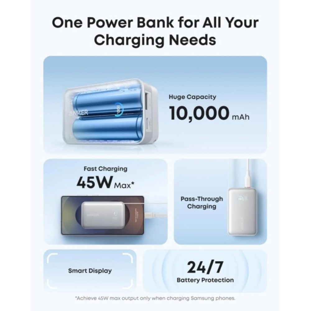 Отримай потужність, коли вона потрібна найбільше. Ємність 10 000 мА·год, швидке заряджання до 45 Вт, підтримка технології наскрізного заряджання (Pass-Through), інтелектуальний дисплей і цілодобовий захист батареї гарантують безпечну та ефективну роботу. Порт USB-C сумісний із Samsung Fast Charging 2.0.