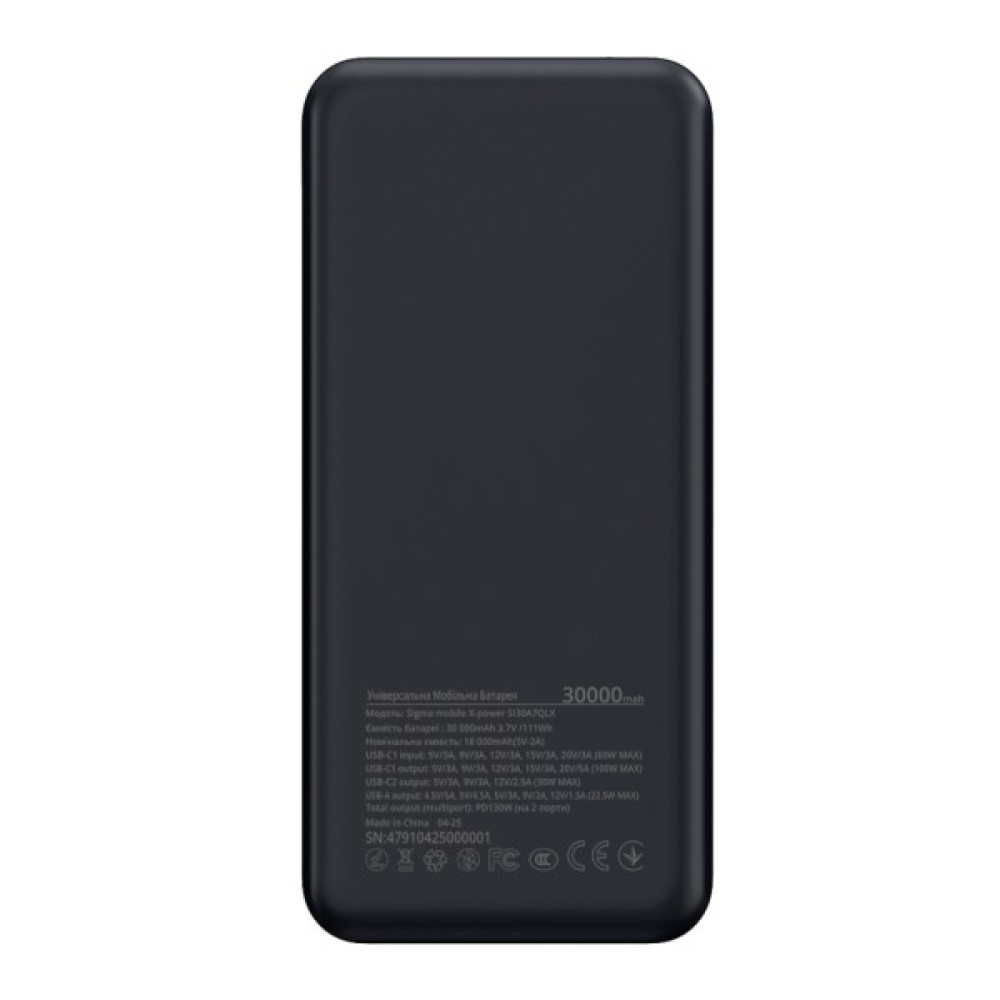 SI30A7QLX PD130W — унікальна новинка із оновленого модельного ряду павербанків від відомого українського бренду Sigma mobile. Це потужний і сучасний павербанк ємністю 30 000 мА*г із максимальною вихідною потужністю до 130 Вт.