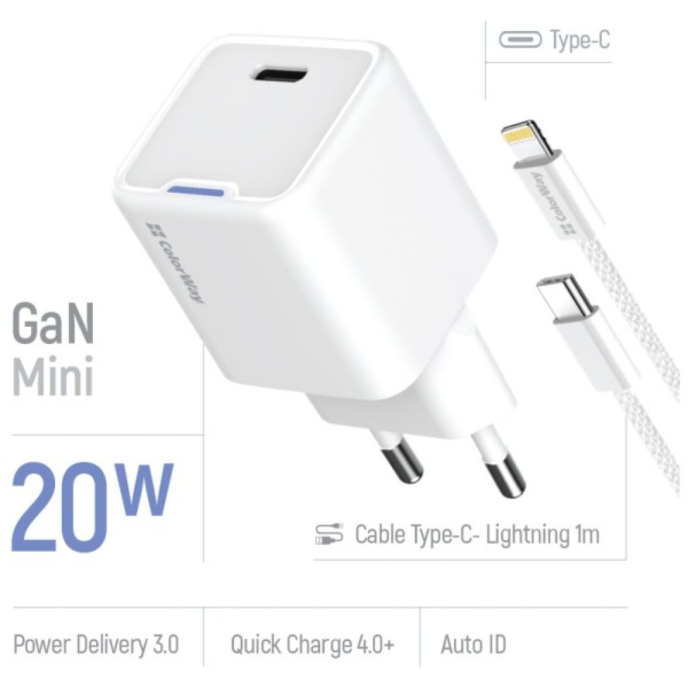 Зарядний пристрій ColorWay C101D GaN Mini 20W PD PPS USB-C + cable USB-C to Lightning white (CW-CHS059PDL-WT)