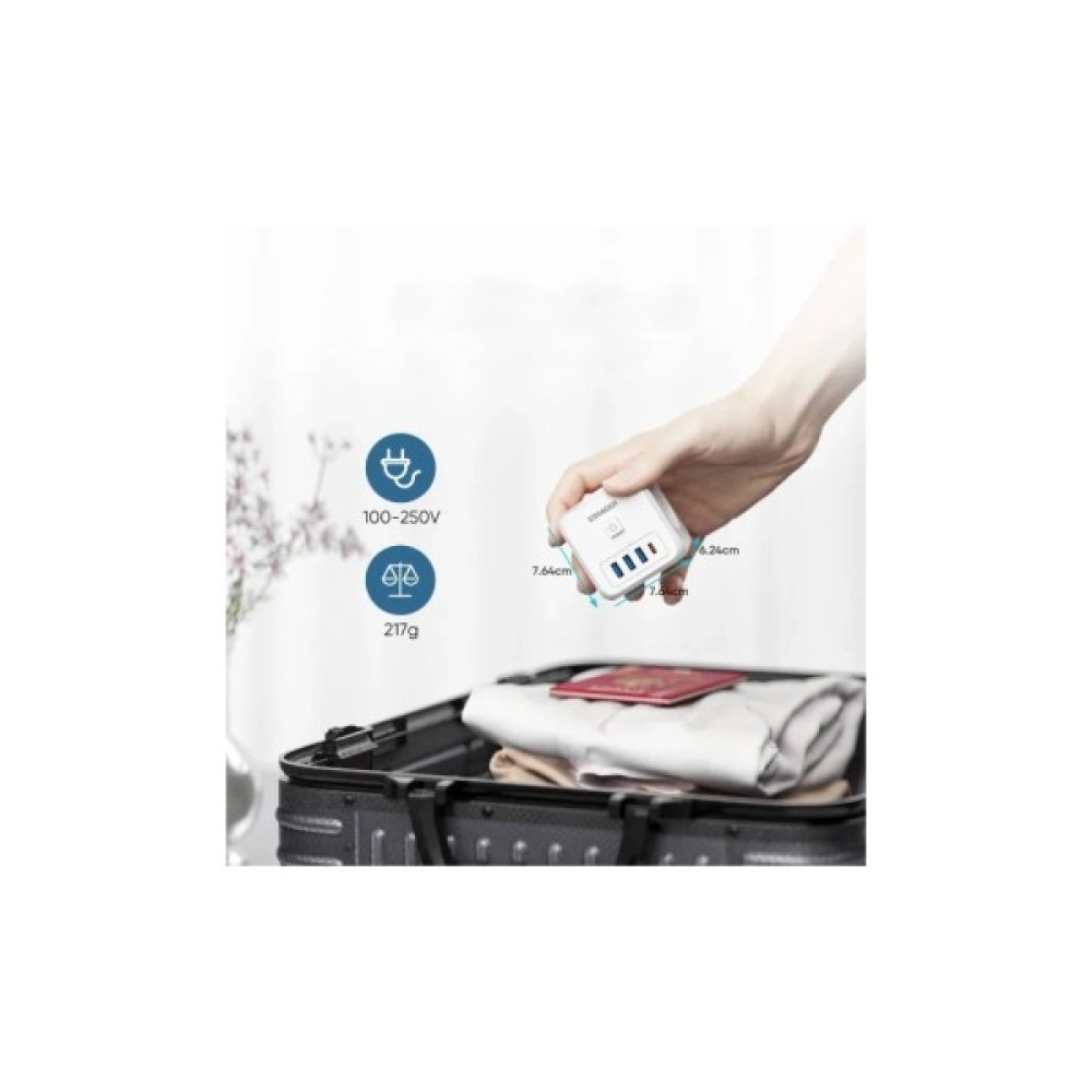вбудований захист прекрасно захищає пристрій від перевантаження, перегрівання, надмірного зарядження та короткого замикання; унікальний дизайн дозволяє одночасно підключати пристрої до 3 розеток, 3 портів USB і 1 порту Type-C, не перешкоджаючи використанню сусідніх розеток.