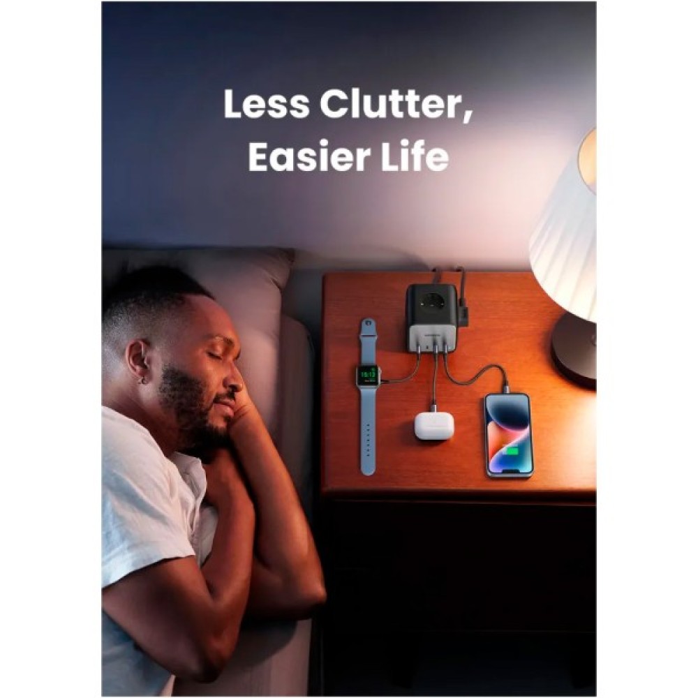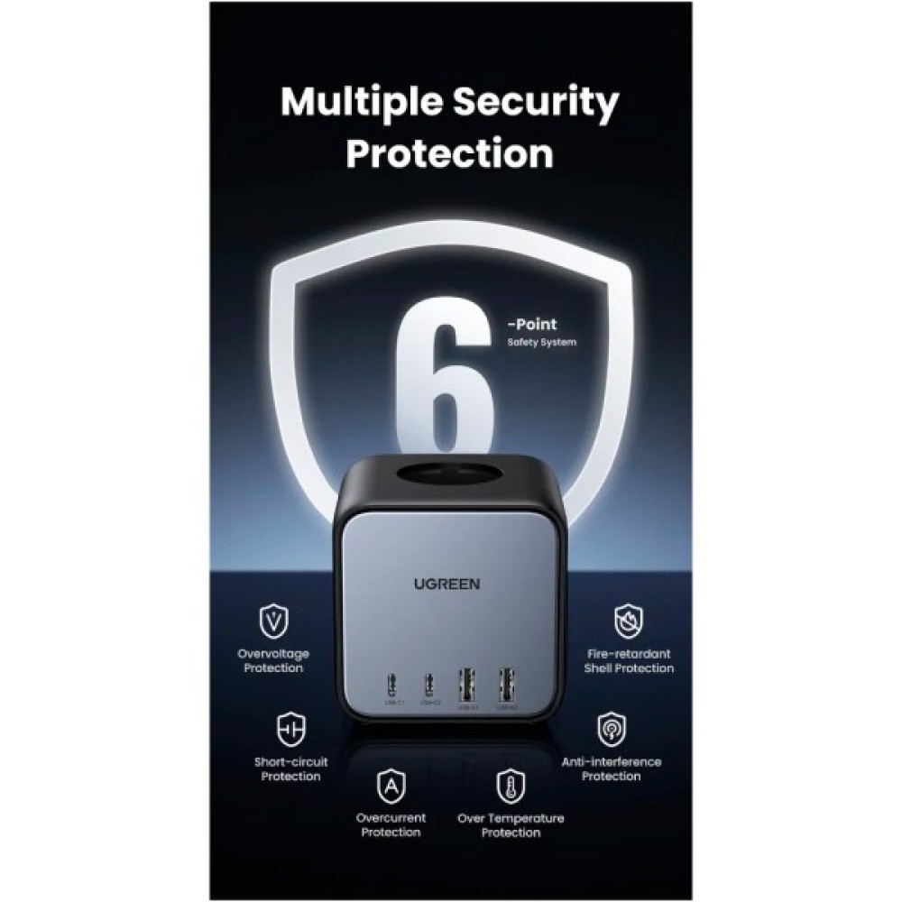 Пристрій живиться від мережі за допомогою вбудованого кабелю довжиною 1.8 м, що забезпечує зручність та гнучкість під час використання. Безпека є пріоритетом цього зарядного пристрою — він оснащений захистом від короткого замикання, перевантаження по напрузі та струму. Завдяки компактному дизайну та вазі у 490 г, UGREEN DigiNest Cube ідеально підходить для використання як вдома, так і в подорожах, де кожен грам має значення, роблячи його ідеальним вибором для тих, хто цінує якість та надійність.