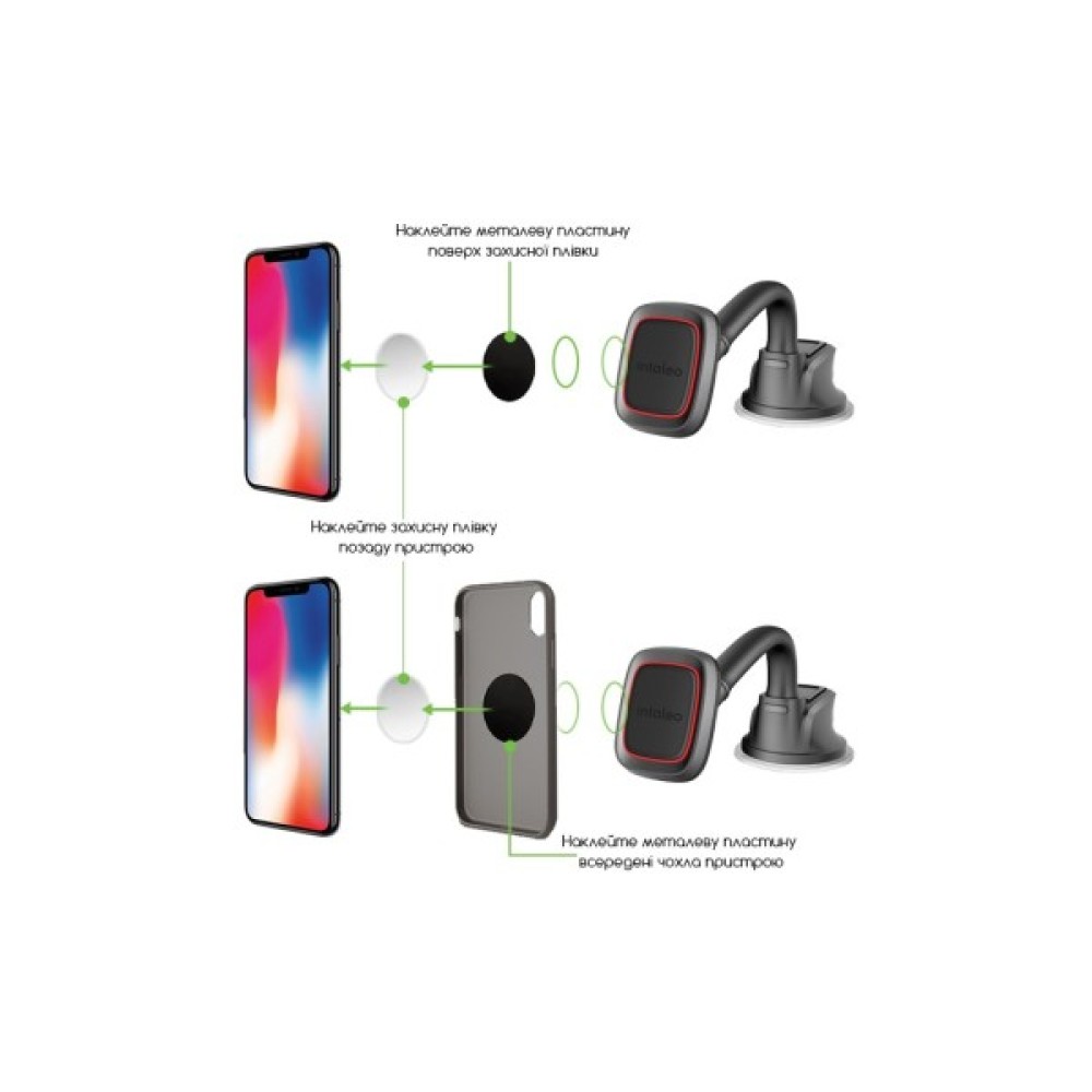 Завдяки магнітним властивостям, смартфон можна дуже легко та швидко фіксувати на автотримачі Intaleo CM02GP. Жодних зайвих рухів — досить просто прикласти пристрій до тримача. Компактний універсальний автотримач Intaleo CM02GP з вбудованим магнітом, який зручно й безпечно кріпиться на чолове скло. Пристрій міцно та надійно фіксується на тримачі CM02GP за допомогою металевої пластини, яку можна закріпити або на самому пристрої, або на його чохлі. У комплект входять металеві пластини різного кольору та форми, а також захисні плівки відповідної форми для використання разом із пластинами. Круглі пластини годяться для смартфонів і невеликих gps-навігаторів. Прямокутна, відповідно — для пристроїв із великою діагоналлю екрана (6-8").