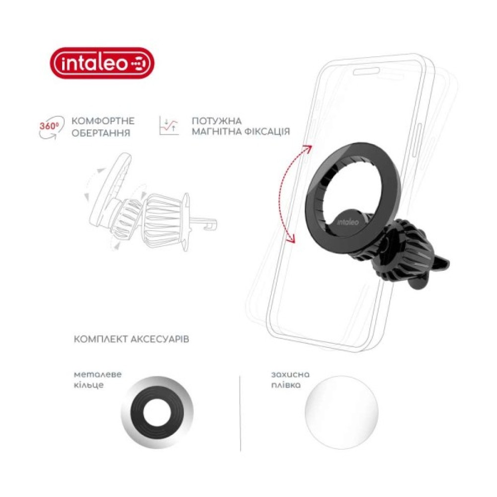 Компактний універсальний магнітний автотримач Intaleo CM06GG — зручно та безпечно кріпиться на решітці вентиляції передньої панелі автомобіля з урахуванням оптимального кута нахилу. Достатньо просто прикласти пристрій до тримача. Автотримач має 20 потужних магнітів, тому пристрій міцно та надійно фіксується на тримачі за допомогою металевої пластини, яку можна закріпити на самому пристрої або на його чохлі. Тримач оснащений прогумованою "головкою", яка має кут оберту в 360 градусів, дозволяючи використовувати смартфон у будь-якому зручному положенні.