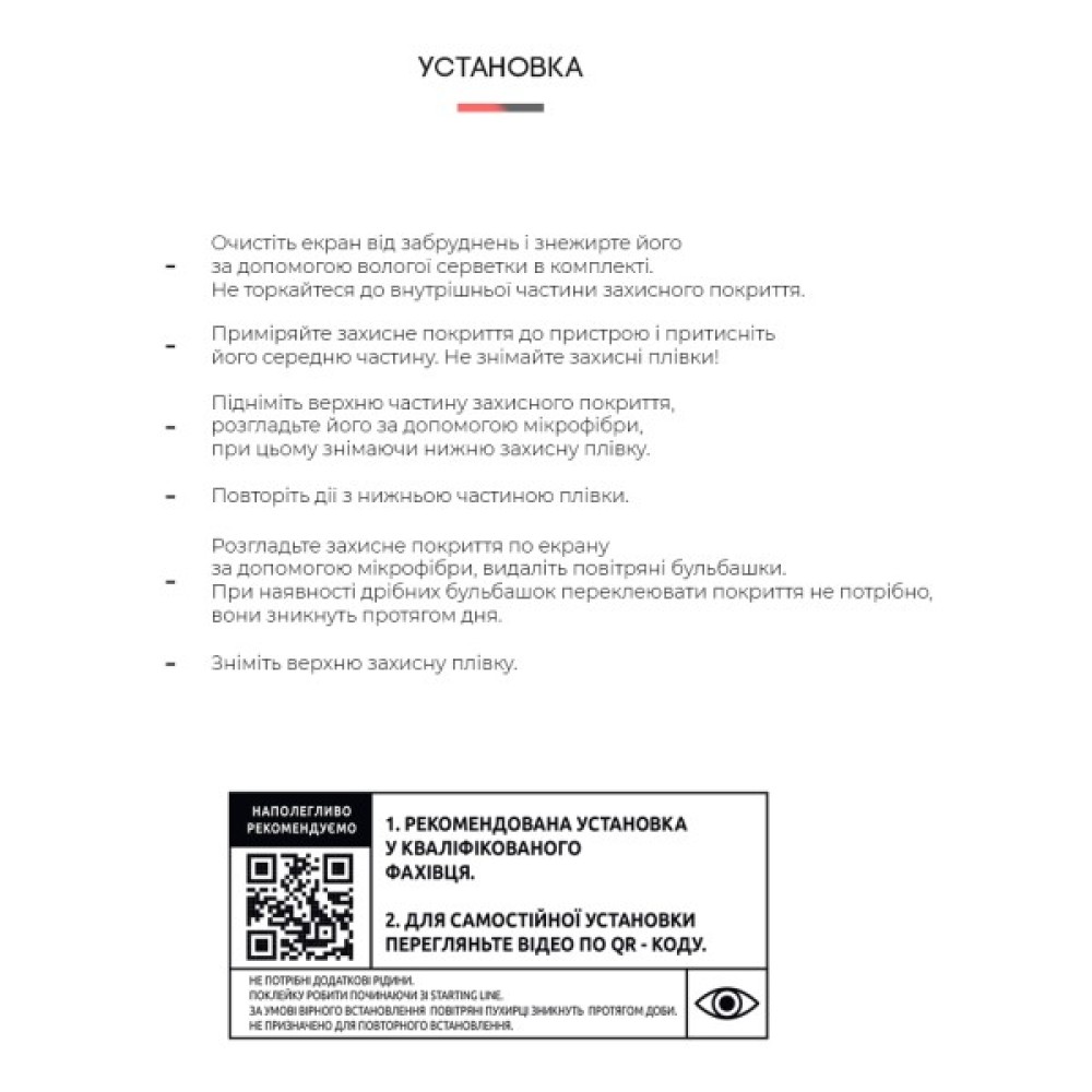 - Очистьте екран від забруднень і знежирте його за допомогою вологої серветки в комплекті. Намагайтеся не торкатися внутрішньої частини захисного покриття.