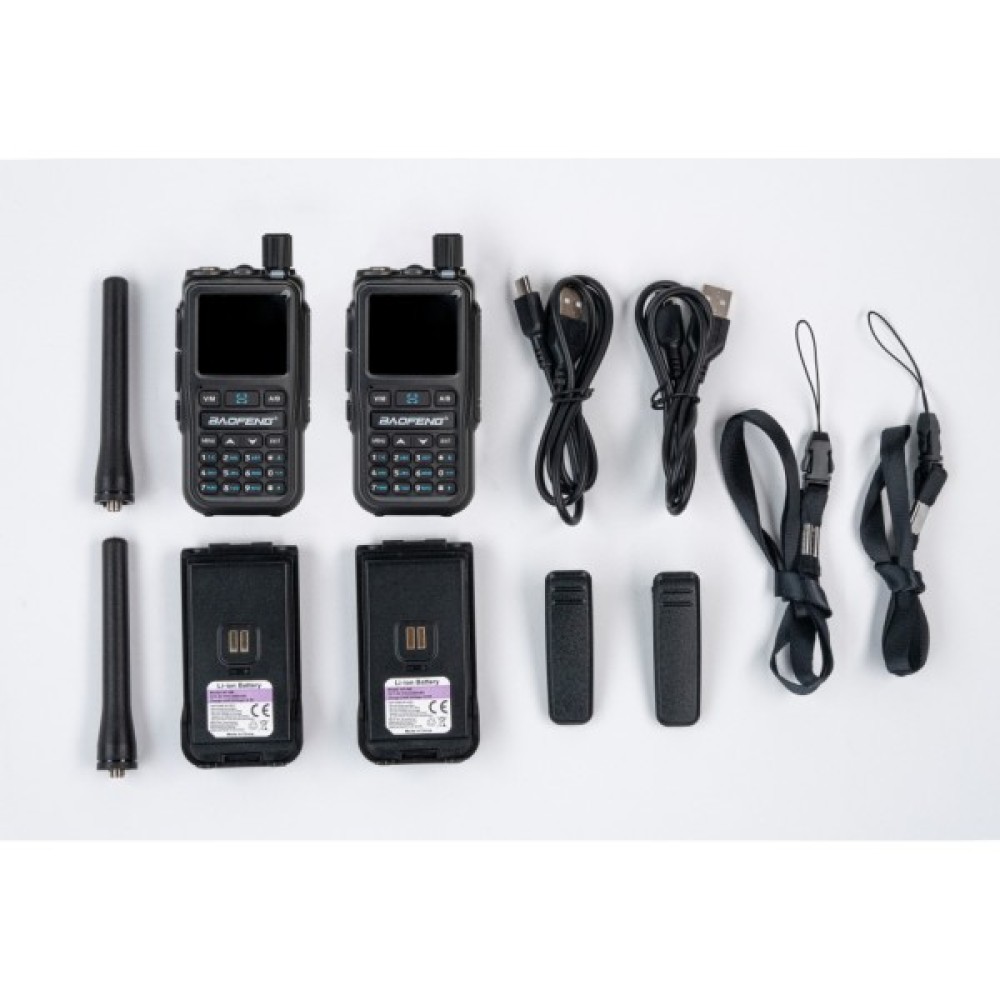 Рація - 2 шт Зарядний кабель USB Type C - 2 шт Антена - 2 шт Акумулятор - 2 шт Кліпса для кріплення на ремінь - 2 шт Шнурок на руку - 2 шт Інструкція (англ) - 1 шт