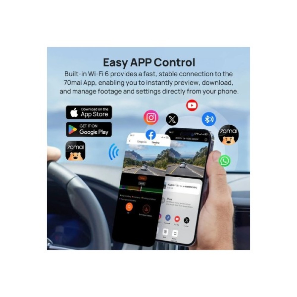 Легке керування, гнучка передача даних. 4K A800SE оснащений вбудованим Wi-Fi 6 (2,4 ГГц) для більш швидкого та стабільного з'єднання. Просто підключіть телефон до точки доступу відеореєстратора через програму 70mai, щоб переглядати, завантажувати відео або настроювати параметри в режимі реального часу - кабелі не потрібні.
