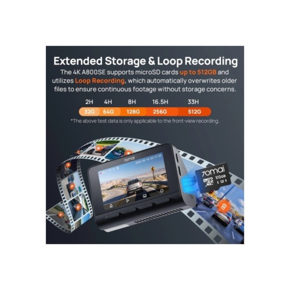 Більше місця для найважливішого. 4K A800SE підтримує карти microSD об'ємом до 512 ГБ, що дозволяє збільшити час запису та зменшує ризик перезапису важливих відео.
