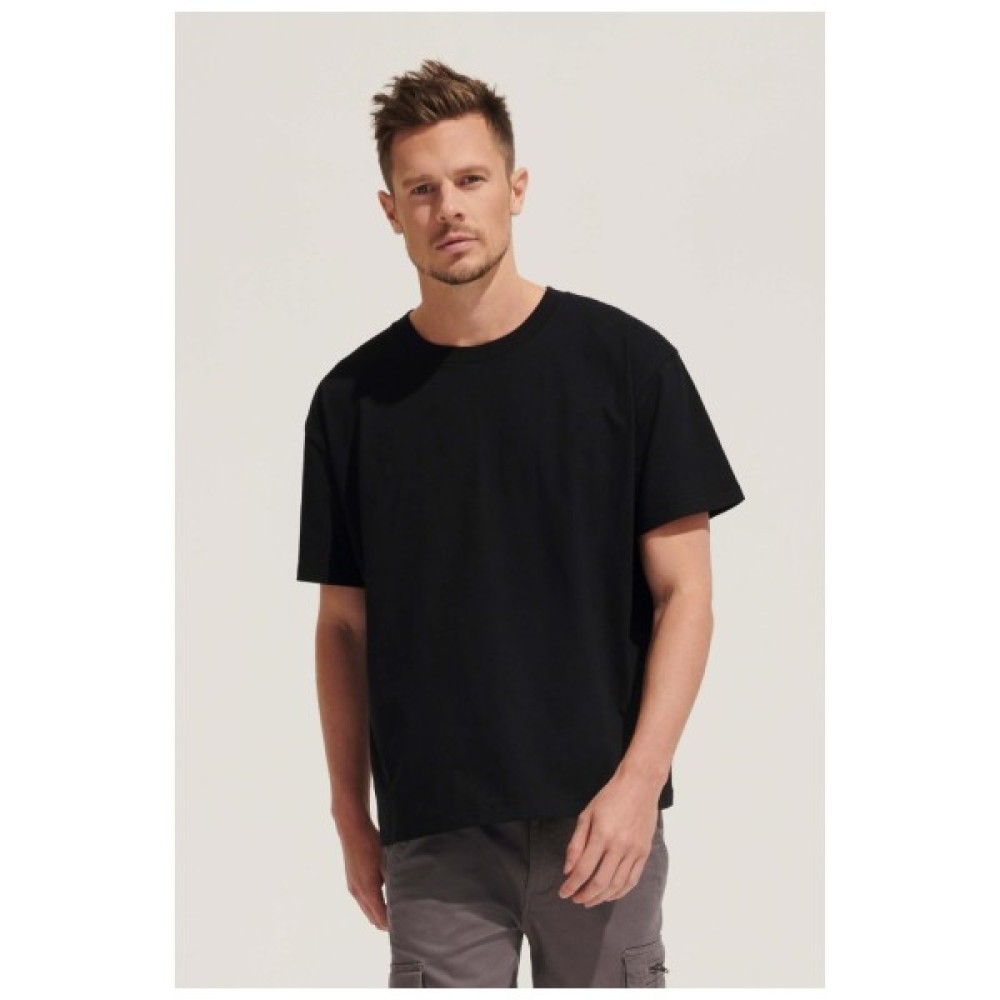 Футболка дуже зручна. Крій оверсайз і опущена лінія плечового шва дозволяють моделі вільно сидіти на фігурі. Кругла горловина оброблена рібаною з додаванням еластану. Щоб футболка тримала форму, на горловині та плечах вшита зміцнююча тасьма.