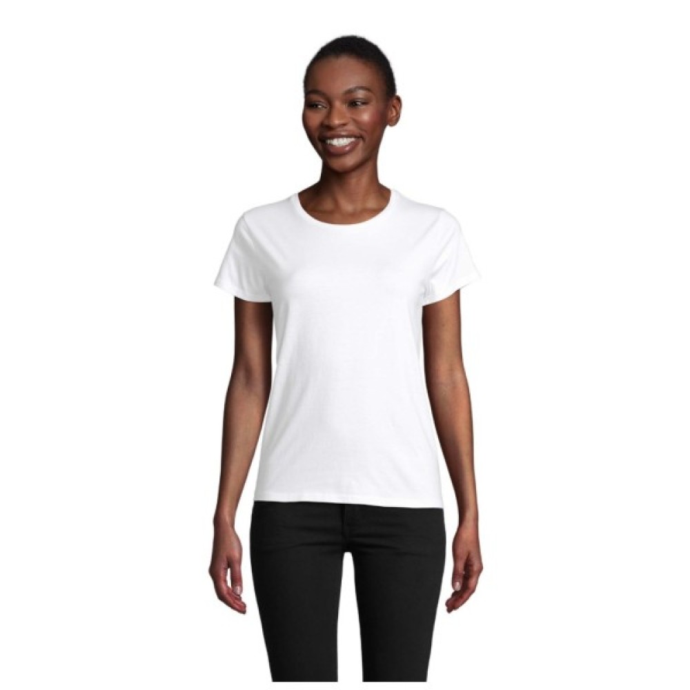 Жіноча футболка PIONEER WOMEN – сучасна модель, яку зручно носити. Облягаюча модель. Футболка виготовлена без бічних швів. Має круглий виріз і короткі рукави. Щоб модель не втрачала форму, комір укріплений зміцнюючою тасьмою.