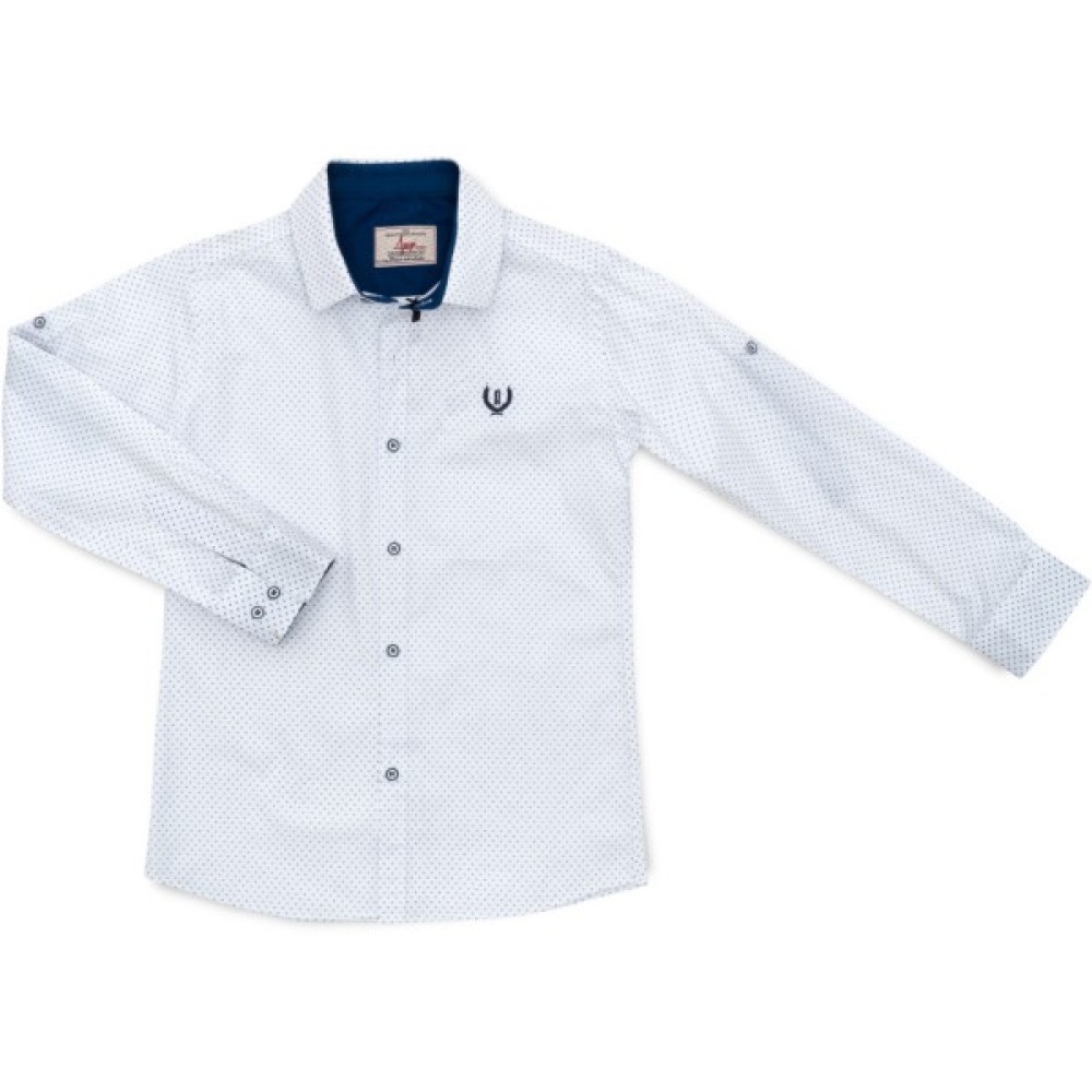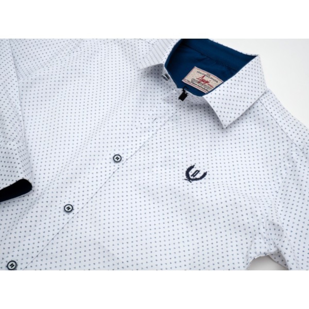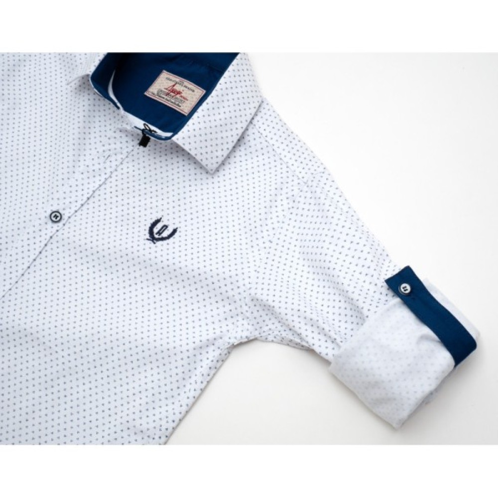 Комір, частина спинки з внутрішньої сторони та манжети з внутрішньої сторони оздоблені контрастним темно - синім матеріалом, стильні біло - сині гудзики оригінально пришиті.
