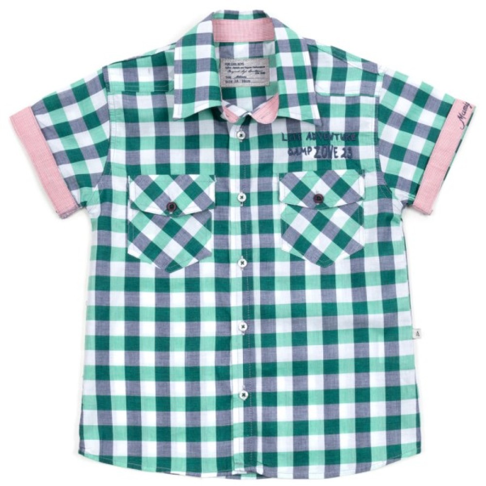 - Чудова, ефектна сорочка прямого покрою, із застібкою на перламутрові ґудзики, з короткими рукавами с підгорнутими манжетами з тканини контрастного кольору та з відкладним коміром зі стійкою.