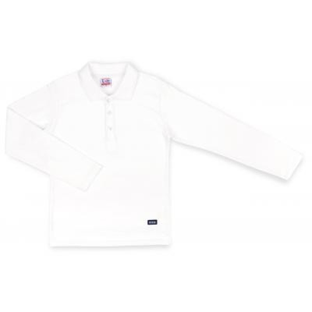 Зручна сорочка - поло білосніжного кольору з довгими рукавами з приємного турецького трикотажу для хлопчика. Тканина дуже приємна на дотик. Кругла горловина оброблена відкладним коміром з трикотажної гумки з класичною застібкою-планкою, яка застібається на три фірмові перламутрові ґудзики.