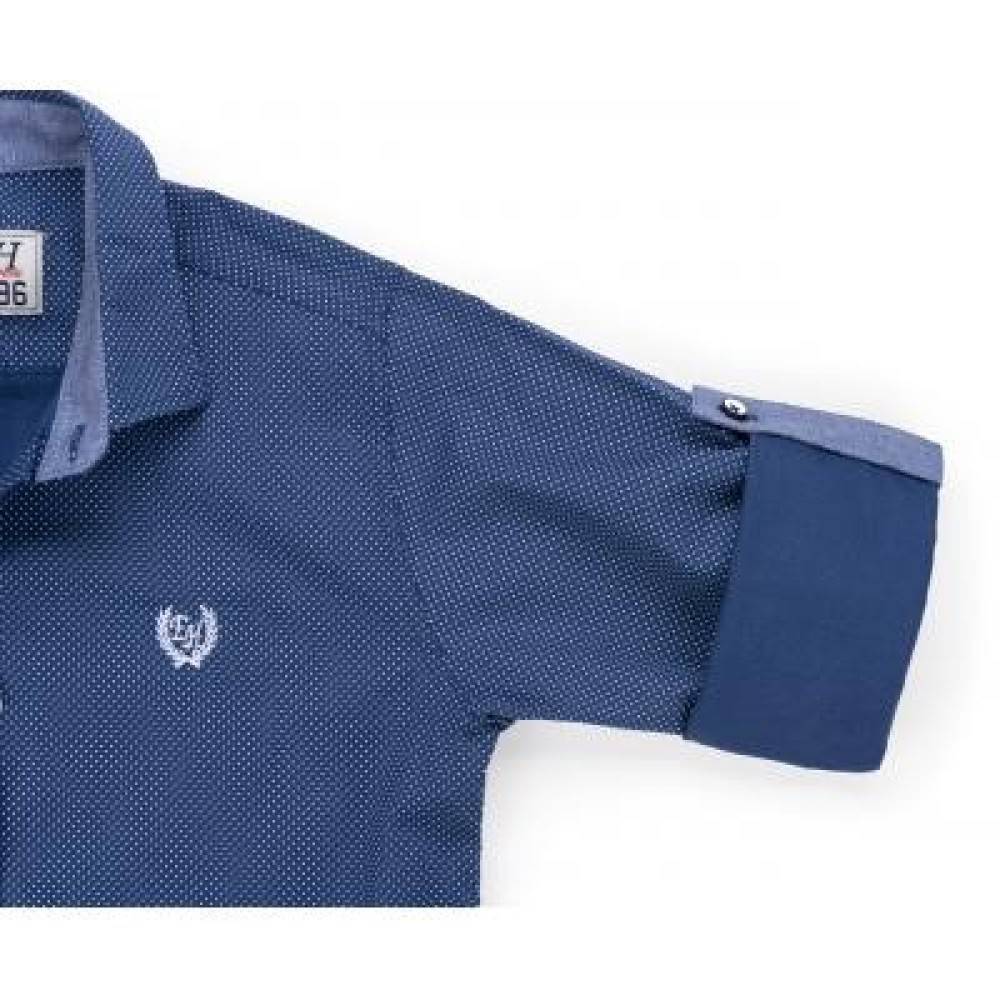 Класична сорочка для хлопчика зі стрейчевої бавовни темно-синього кольору в білу крапочку з довгими рукавами на манжетах. На грудях, з лівого боку, невеликий вишитий фірмовий логотип «E & H». Низ закруглений. Класичний відкладний комір, застібка-планка, спереду по-центру, і манжети на рукавах застібаються на ґудзики. Внутрішня частина манжет, планки та стойки коміра оброблено тканиною кольору денім. Рукава можна закочувати і фіксувати хлястиками (колір денім) та ґудзиками.