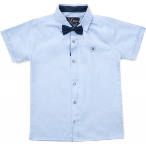 Класична сорочка - теніска прямого силуету, з короткими рукавами, з натуральної бавовни (не тягнеться). На грудях, з лівого боку, невеликий вишитий фірмовий логотип «B» (Breeze). Класичний відкладний комір, застібка - планка, спереду по - центру, застібаються на красиві гудзики. Внутрішня частина стійки коміра - темно - синього кольору, що дуже зручно, практично і красиво. Сорочка укомплектована стильним краваткою - метеликом на гумці темно - синього кольору. Тканина дуже приємна на дотик, цікавого плетіння.