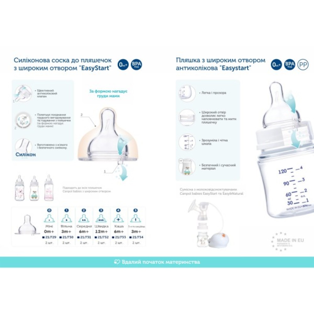 Соска EasyStart від Canpol babies розроблена спеціально для пляшечок із широким горлом. Виготовлена з високоякісного м'якого силікону. Форма соски схожа на форму грудей, що дає змогу поєднувати грудне вигодовування з годуванням із пляшечки. Спеціальна система виходу повітря (антикольковий клапан) не дає змогу їжі змішуватися з повітрям, знижує ризик виникнення кольок.