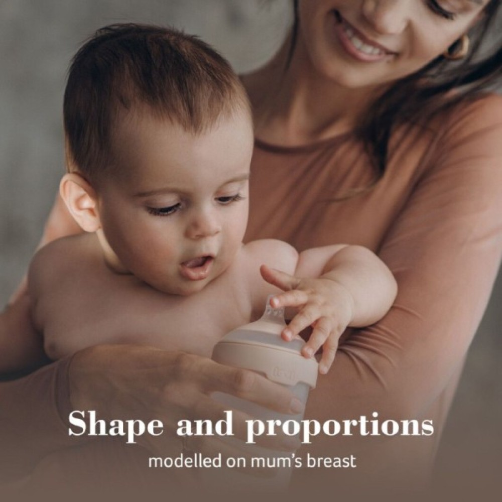 - Широка, профільована форма, змодельована за зразком маминих грудей, та ідеальні пропорції гарантують, що ротик дитини розташований під правильним кутом, губи щільно стиснуті, а дитина може вільно дихати через ніс, що зменшує ризик виникнення колік.