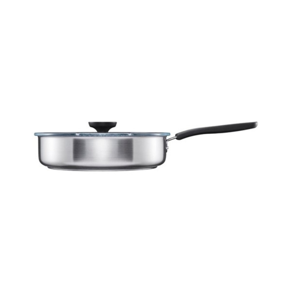 Сковорода має міцну кришку з вбудованим ситечком, що дозволяє точніше розподіляти порції. Кришка має простий дизайн ручки та функцію контролю кипіння, а плоска форма робить її дуже зручною для зберігання. Можна використовувати в духовці за температури до 150°C. Підходить для всіх типів плит.