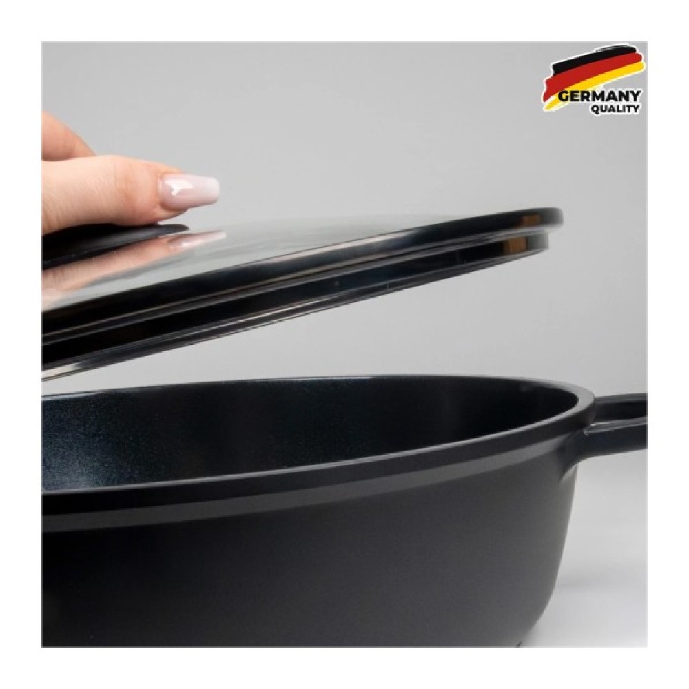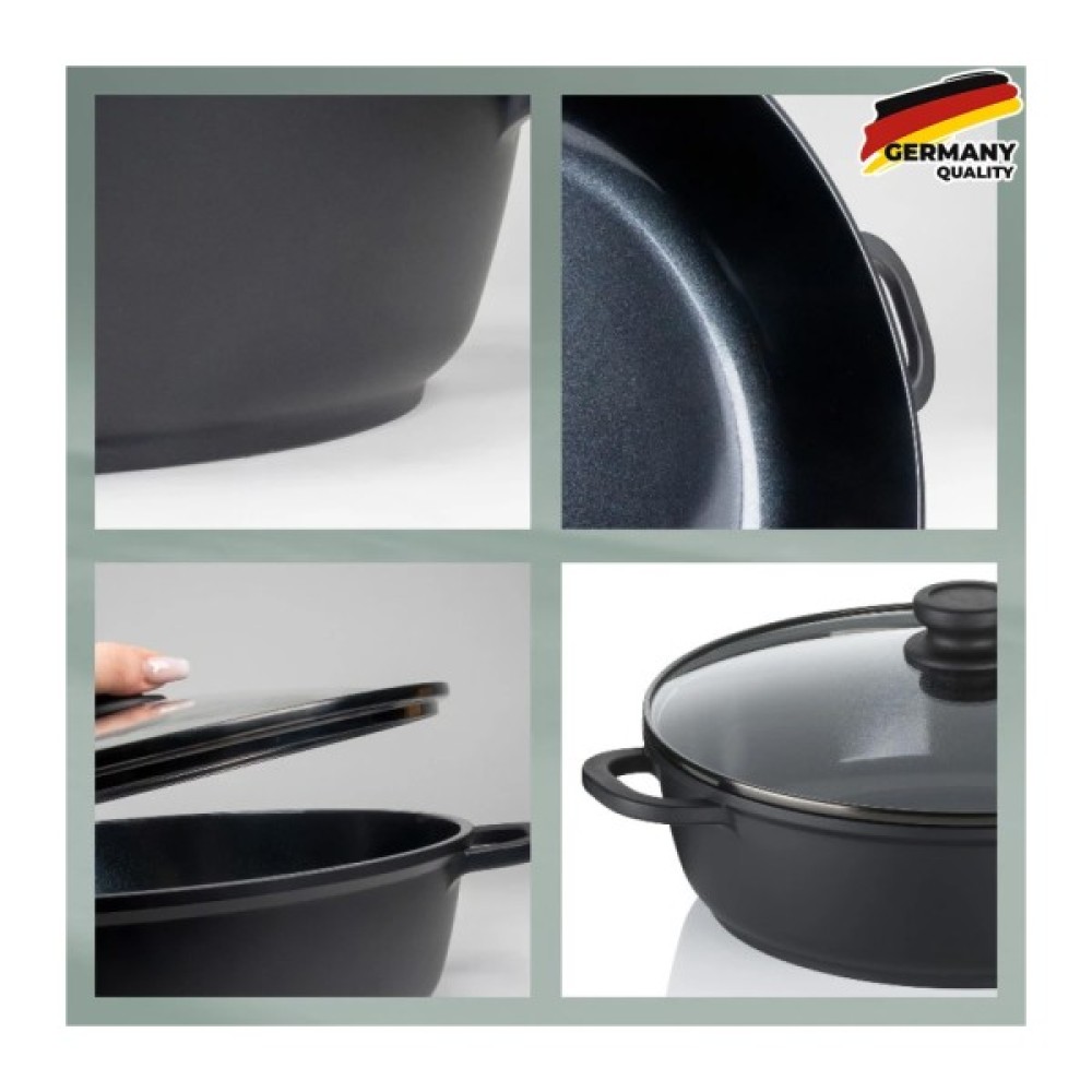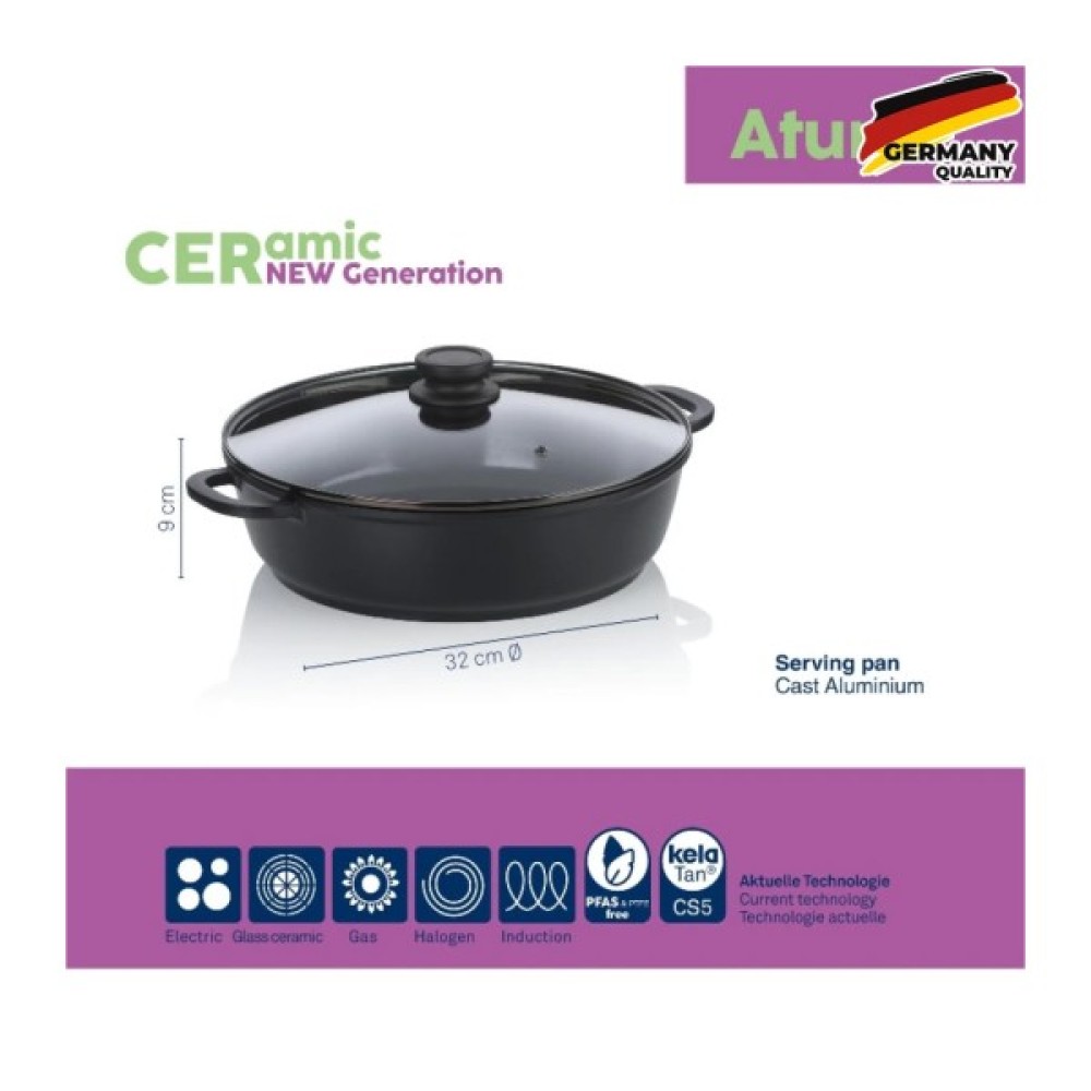 Керамічне покриття сотейника Kela Atura без ПФАС (PFAS), термостійкість виробу до 250° C. Розміри (Д х Ш х В): 28 x 28 x 9 см.