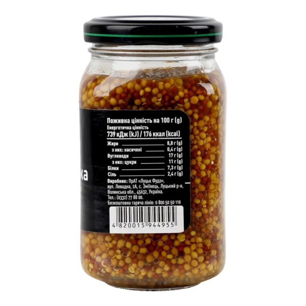 вода питна, зерно гірчиці білої та сарептської (28.5%), оцет винний, цукор, сіль кухонна, регулятор кислотності – оцтова кислота, куркума мелена.