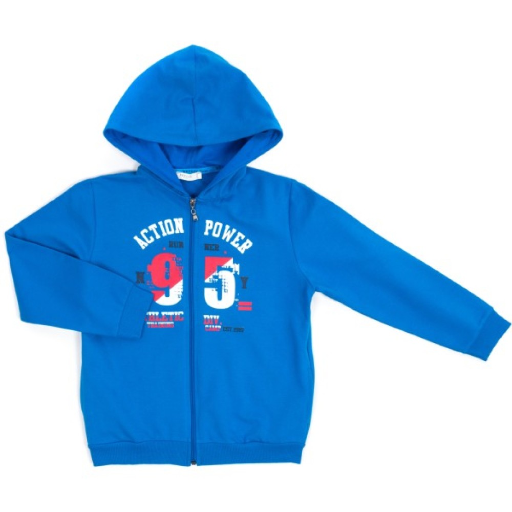 • Кофта красивого кольору синій-електрик, на блискавці, з довгими рукавами і нез'ємним каптуром, з кишенями в бічних швах (без застібки). Капюшон подвійний, на трикотажній підкладці. Блискавка якісна капронова з металевим бігунком. Манжети на рукавах і по низу «олімпійки» - з широкої якісної подвійної трикотажної «гумки». Олімпійка прикрашена спереду контрастним, об'ємним кольоровим принтовим малюнком.