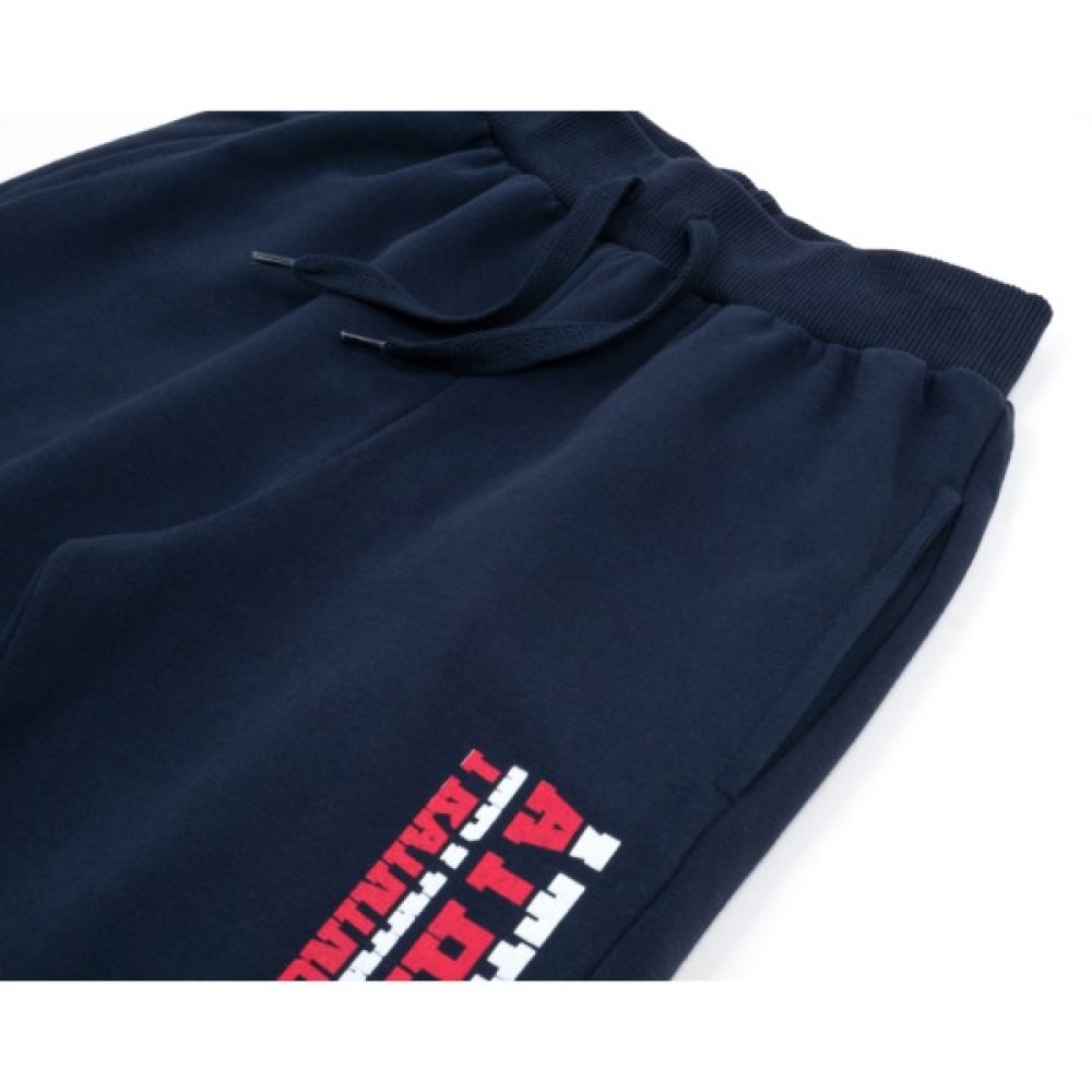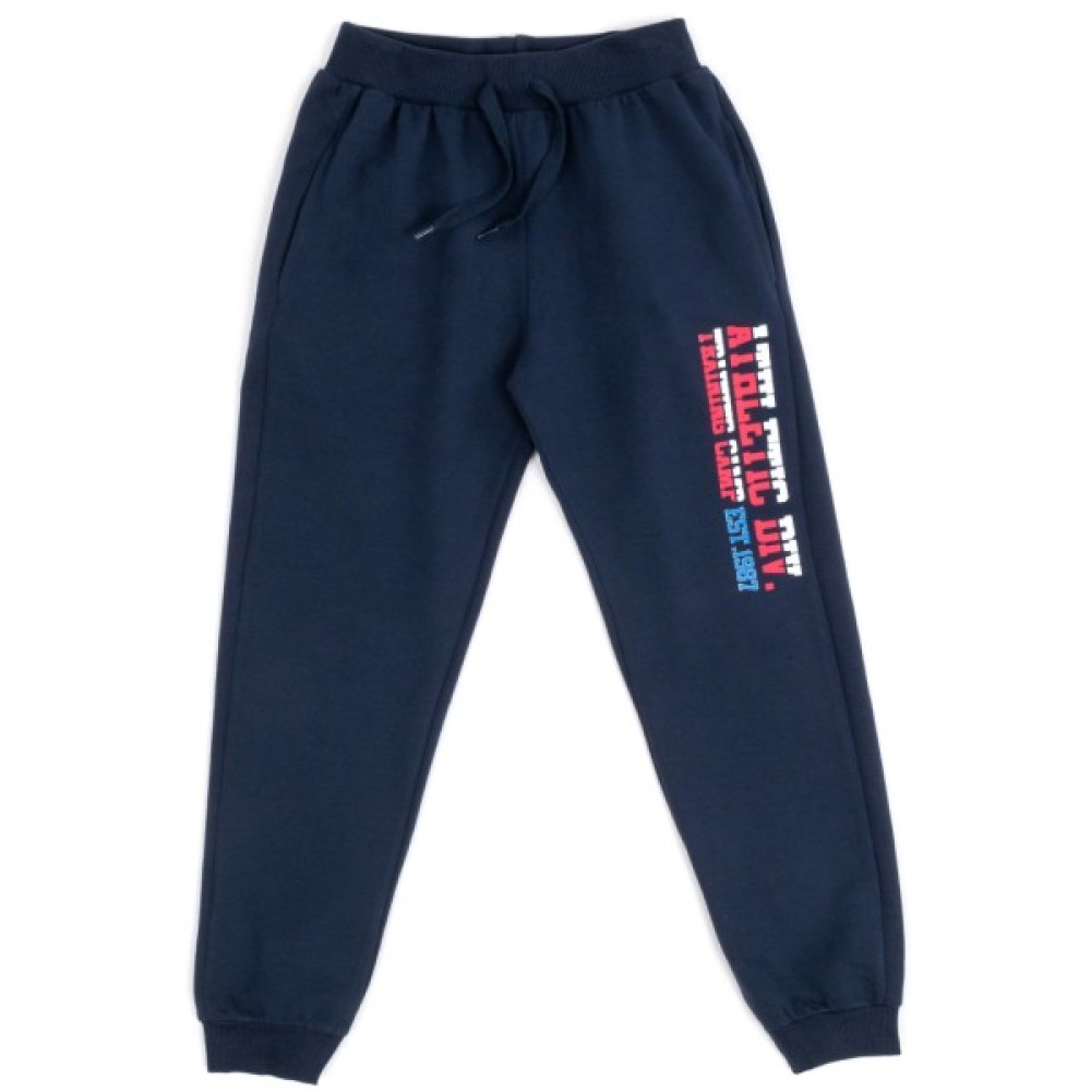 • Затишні темно-сині штани на манжетах, з двома прорізними кишенями, також прикрашені на лівій штанині принтовим кольоровим стильним написом. Еластичний пояс і манжети, в подвійну трикотажну «гумку», забезпечать затишок і оптимальну посадку по фігурі. Пояс додатково посилений широкою, вставленою всередину, «гумкою». Шнурок декоративний.