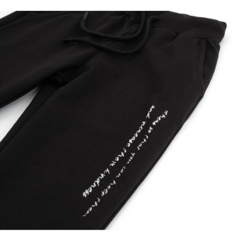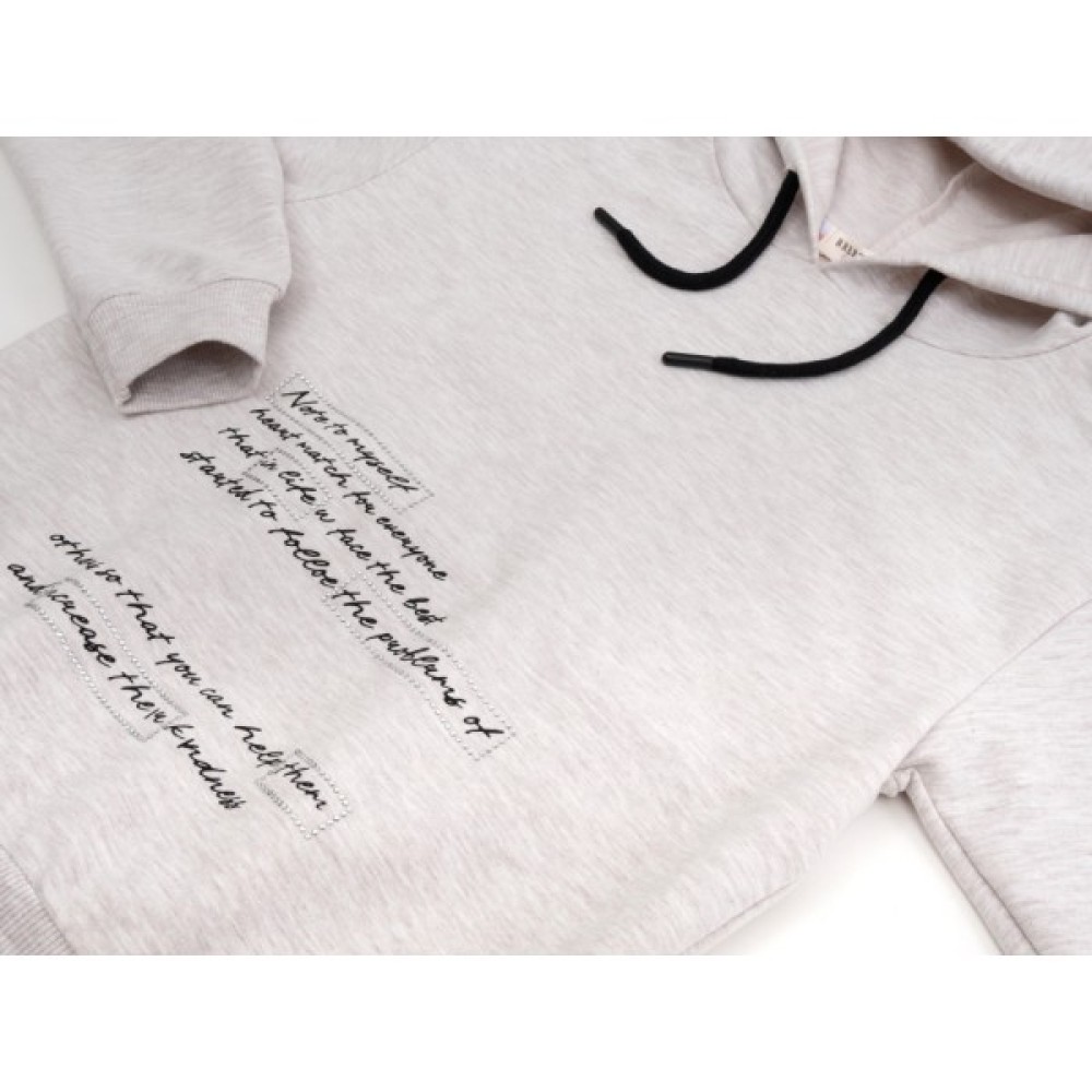 • Худі прикрашений з переду акуратними дрібними принтовими написами чорного кольору та сріблястими стразами, штани - принтовими написами бежевого кольору.