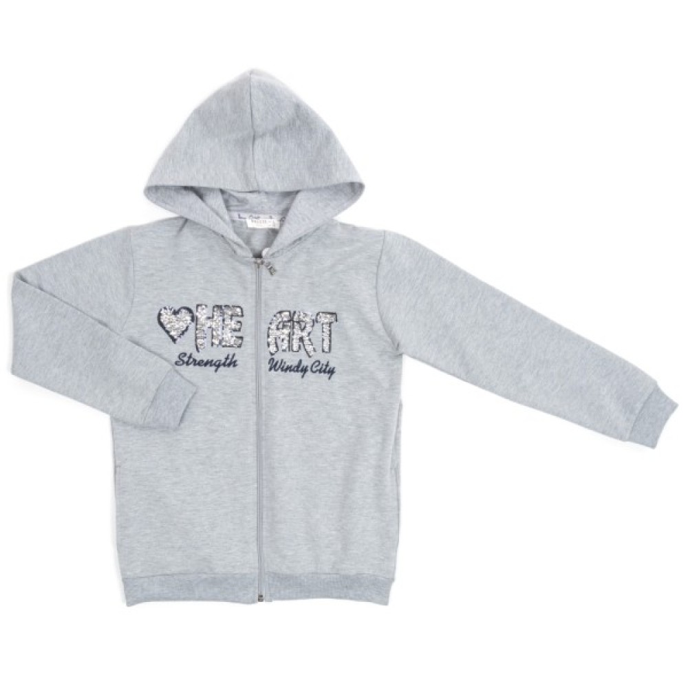 • Модний, меланжевий спортивний костюм для дівчинки світло-сірого кольору в стилі «спортивний шик»: кофта - «олімпійка» на «блискавці» з капюшоном і штани на манжетах.