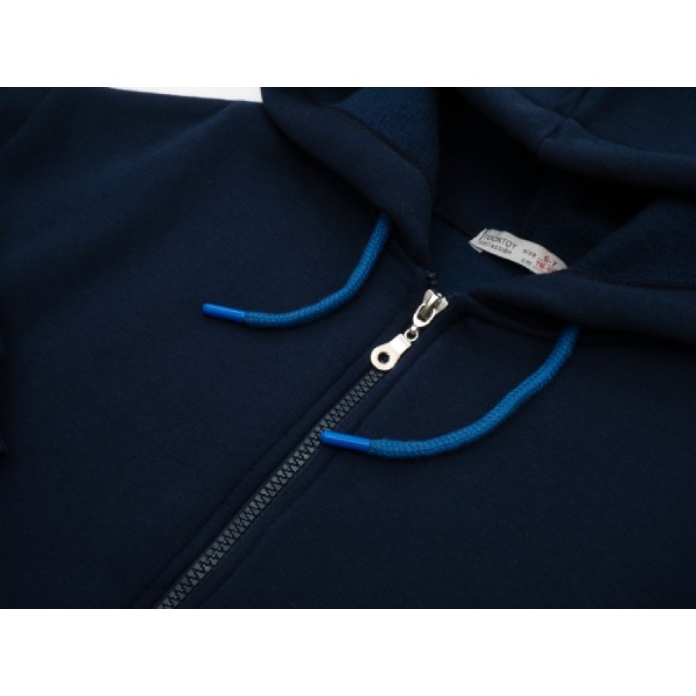 - Модний, дуже ефектний, зручний та теплий темно-синій вільний спортивний костюм з каптуром, прикрашений кольоровими принтовими накатами та фірмовою нашивкою від тм Toontoy: кофта-олімпійка з каптуром та штани на манжетах.