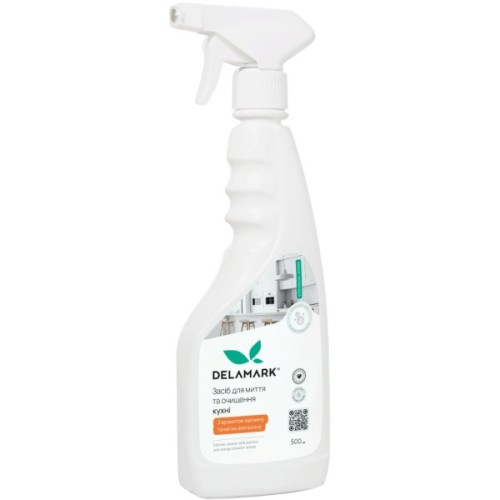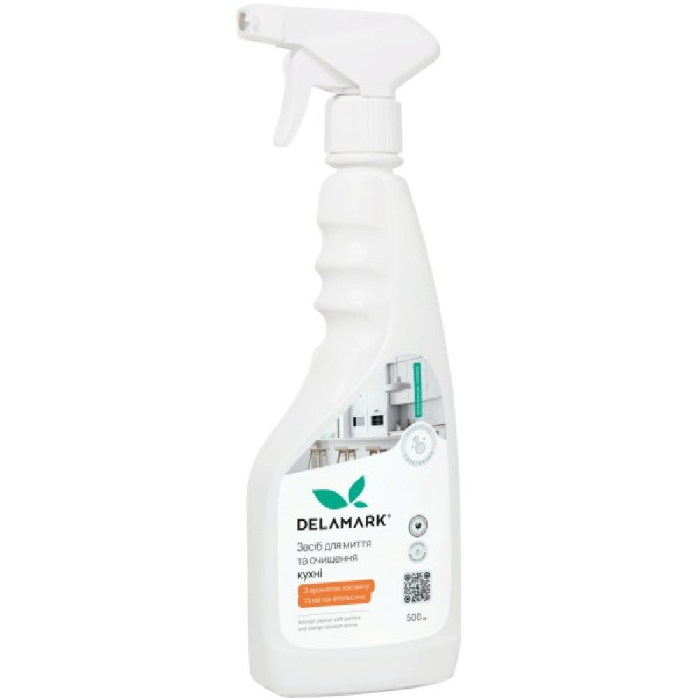 Засіб для миття та очищення кухні DeLaMark із вишуканим ароматом жасмину та апельсинової квітки дуже економний, легко наноситься, добре змивається та має зручну упаковку з розпилювачем для комфортного використання.